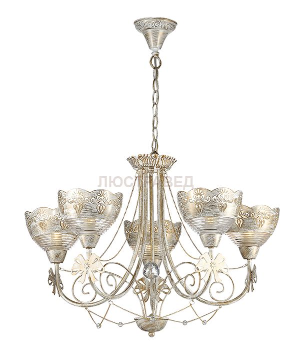 Арматура, декор: металлические элементы в виде бантиков, цепочки с искусственным жемчугом; плафон: тисненое стекло, металл с ажурным рисунком