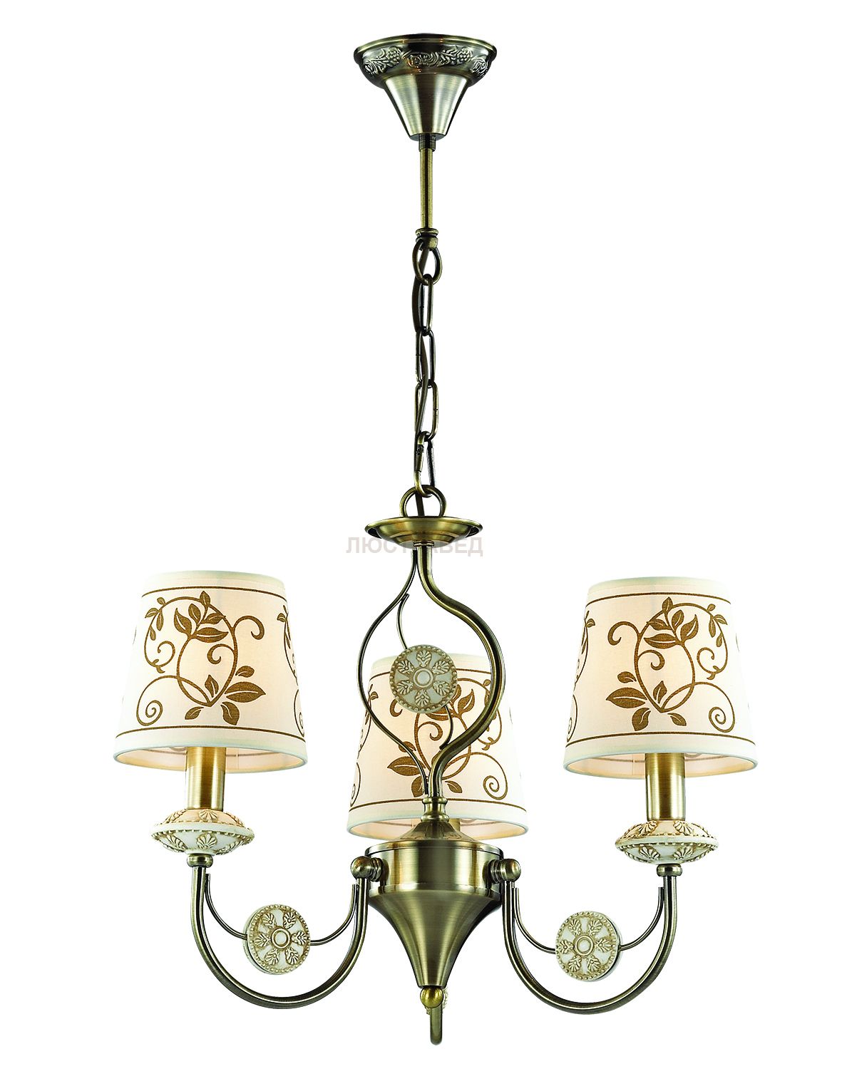 Арматура, декор: металли, декоративные элементы из полирезины; плафон: тканевые абажуры с рисунком цвета кофе