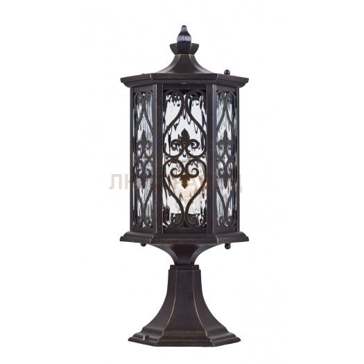 Корпус из металла, устойчивый к перепадам температуры. Покрытие бронзового цвета. Плафон из прозрачного стекла.