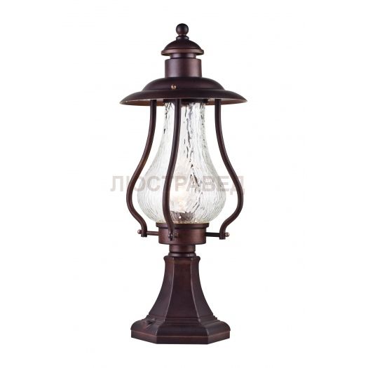 Корпус из металла, устойчивый к перепадам температуры. Фирменная гравировка. Плафон из прозрачного фактурного стекла.