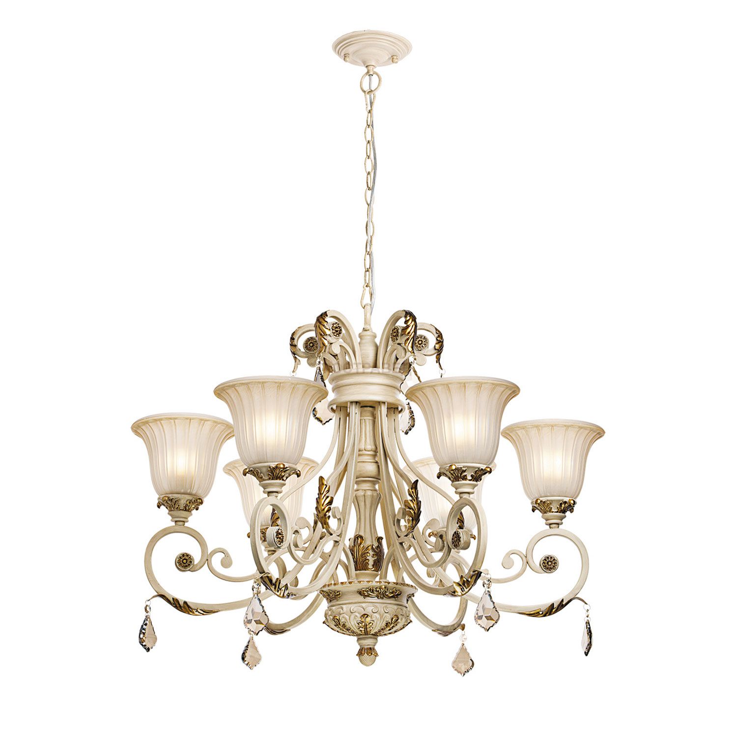 Кованое металлическое основание цвета патинированной карамели, плафоны из стекла с перламутровым отблеском, декоративные элементы из крашеного металла и гальванизированного хрусталя