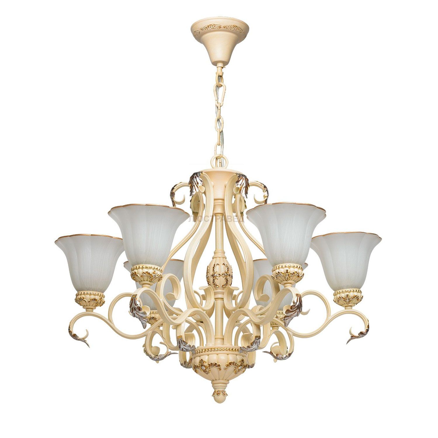 Кованое металлическое основание молочного цвета, плафоны из стекла с перламутровым отблеском и декоративной крашеной каёмкой
