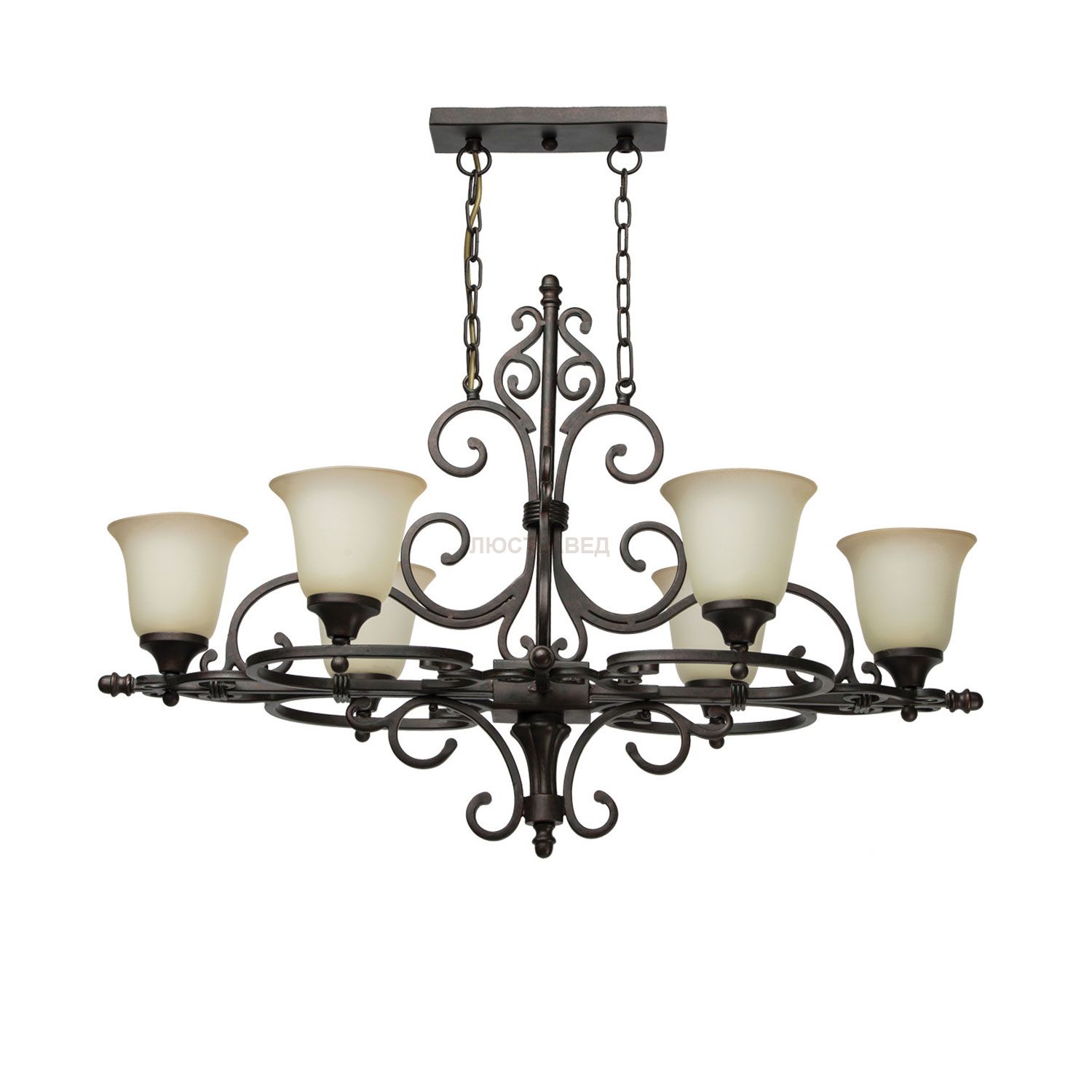 Кованое металическое основание, стекляные плафоны.