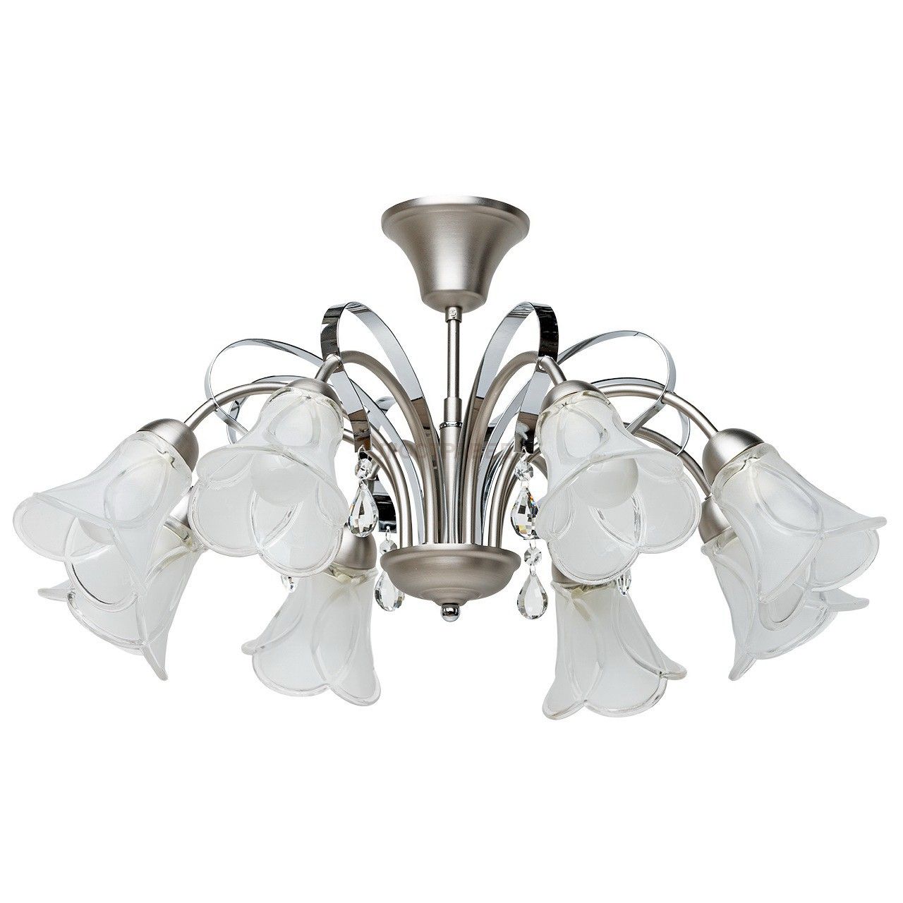Металлическое основание цвета матового никеля и блестящего хром, стеклянные плафоны, декоративные элементы из хрусталя