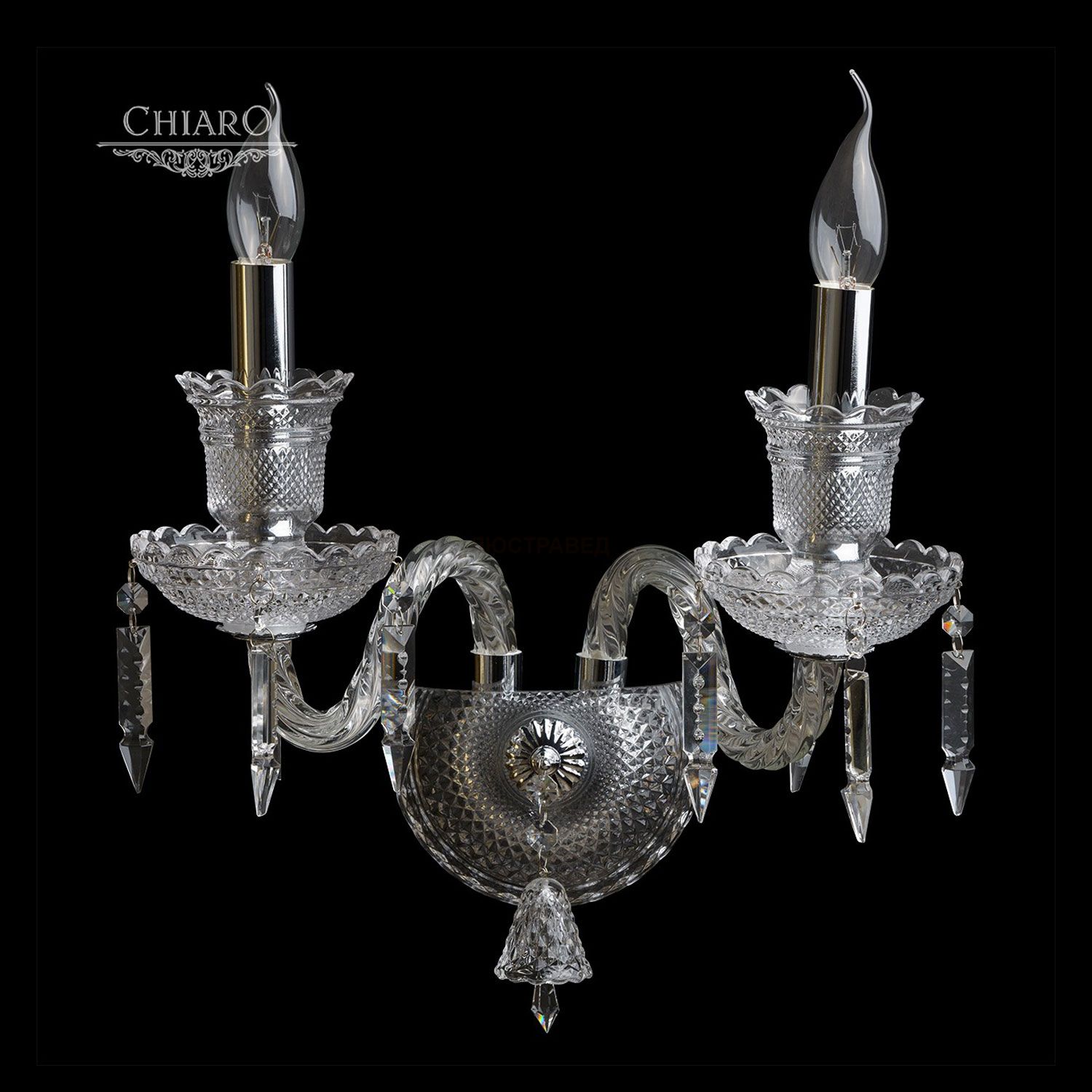 Металлическое основание цвета хрома, декоративные элементы из стекла и прозрачного хрусталя