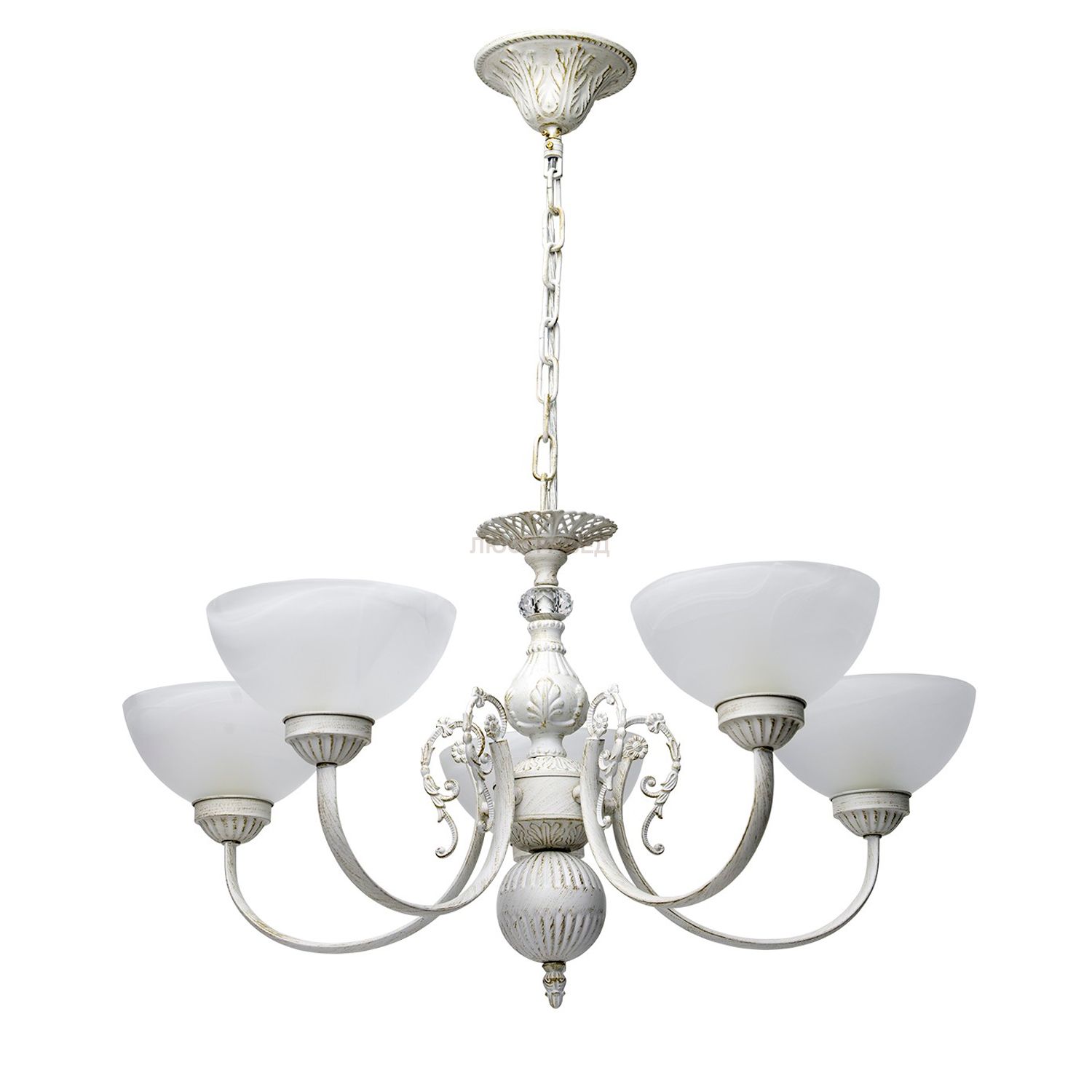 Крашеное металлическое основание цвета слоновой кости с золотой патиной, плафоны из матового стекла, декоративные элементы из хрусталя и металла