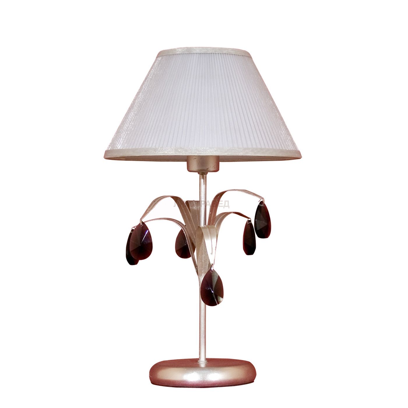 Металлическое основание, покрытое сусальным серебром, текстильные абажуры, декоративные подвески из хрусталя