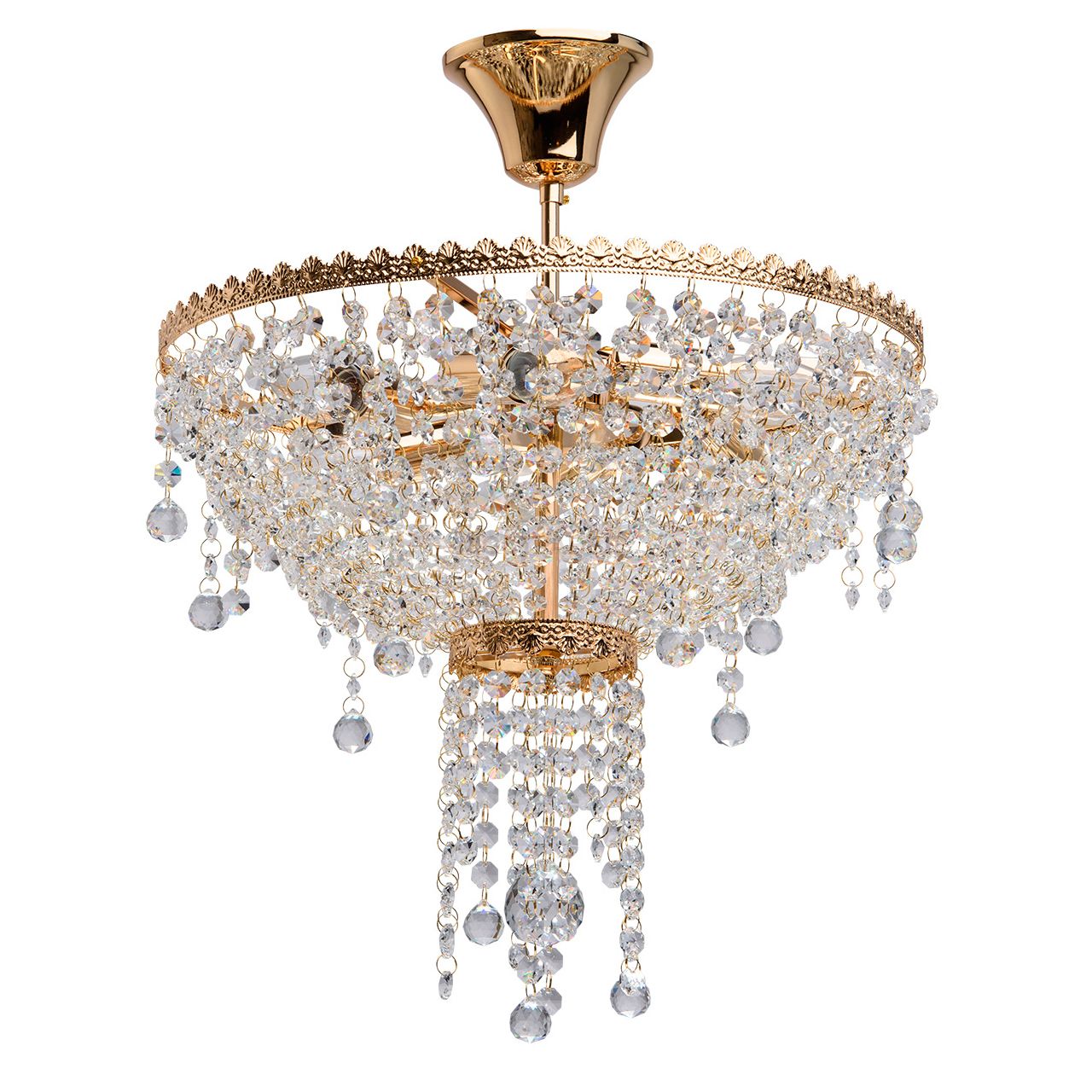 Арматура светильника выполнена из сплава металла и гальванизирована в цвет золота. Каркас декорирован чеканкой. Для декора свеетильника использованы элементы в виде хрустальных бус и октагонов разных размеров, придающих светильнику объем.