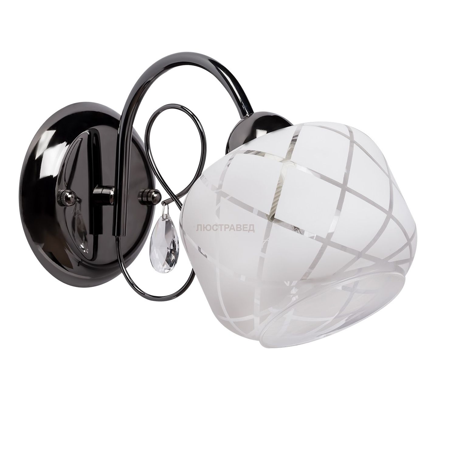 Металлическое основание цвета никеля, стеклянный плафон, декоративная подвеска из хрусталя.