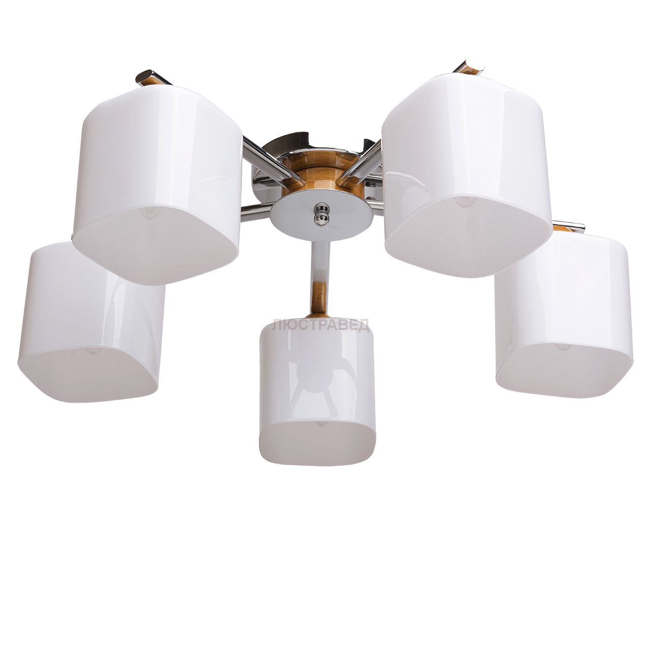 Металлическое основание цвета хрома, плафоны из стекла белого глянцевого цвета, декоративные элементы цвета дерева