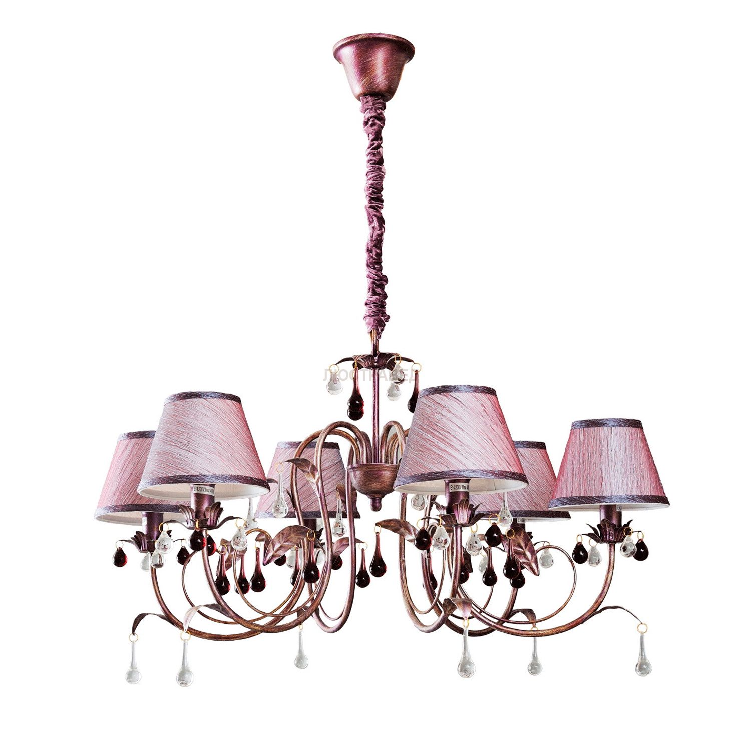 Крашеное металлическое основание, текстильные абажуры, декоративные элементы из цветного стекла.