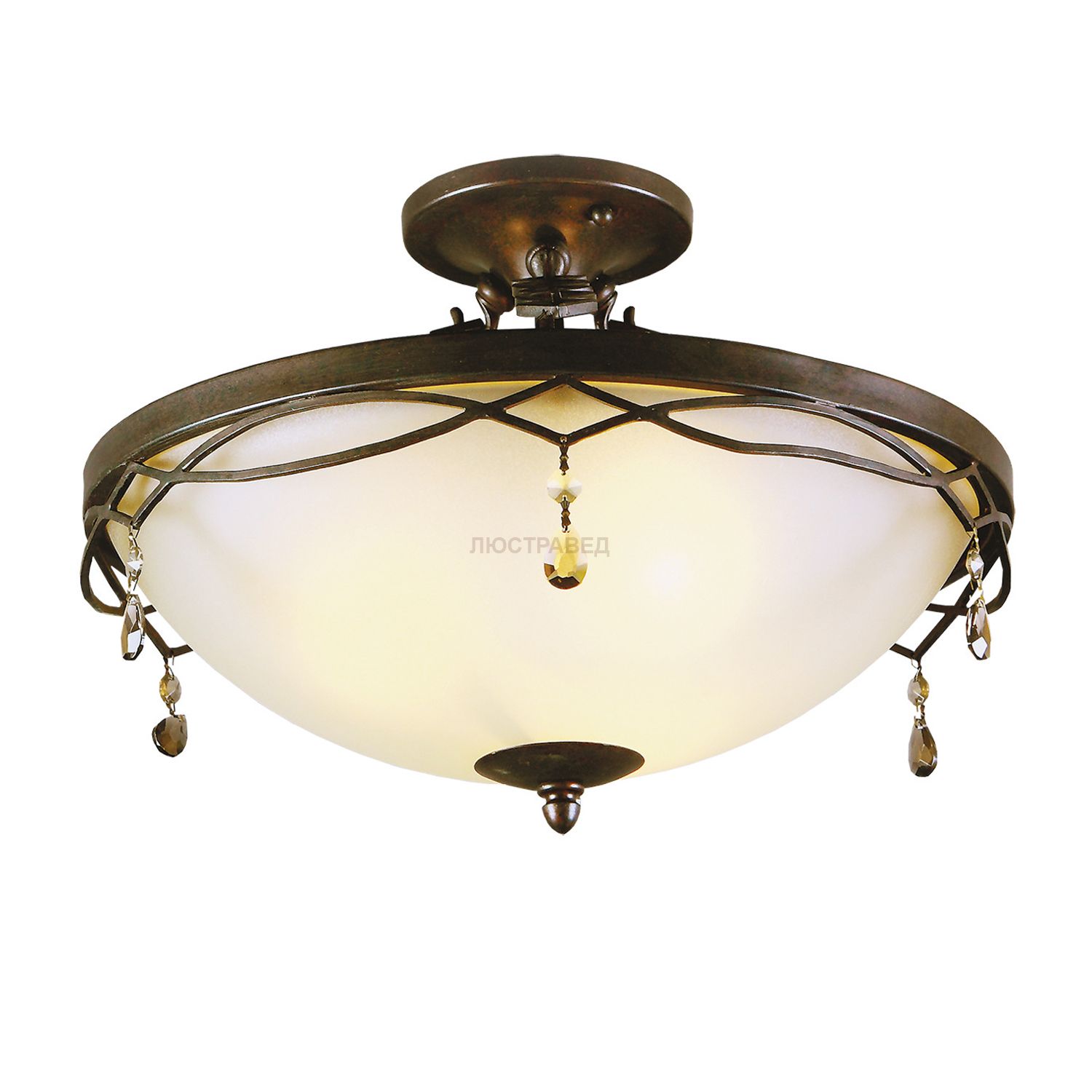 Кованое металлическое основание ручной работы, плафоны из матового стекла, декоративные подвески из хрусталя