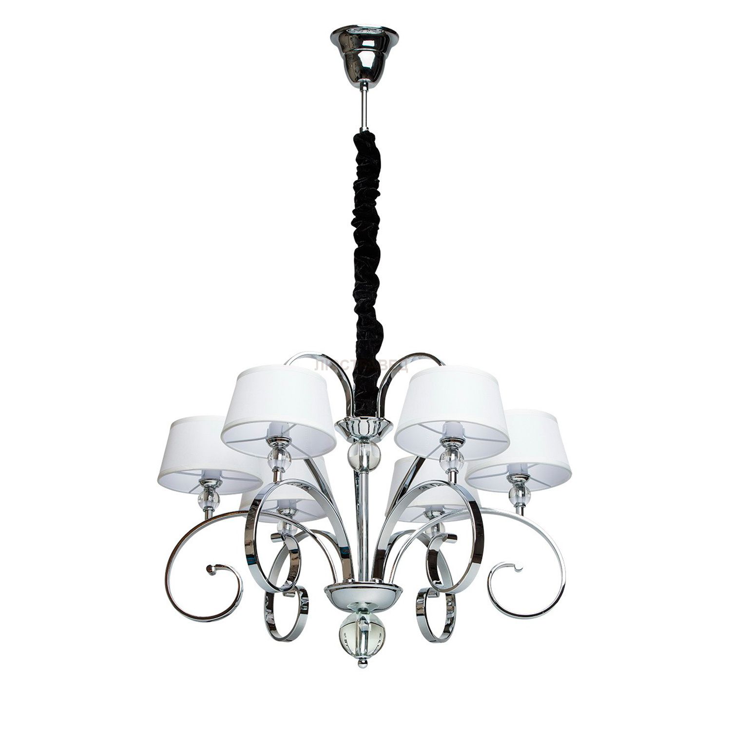 Металлическое основание цвета хрома, декоративные элементы из хрусталя, атласные абажуры