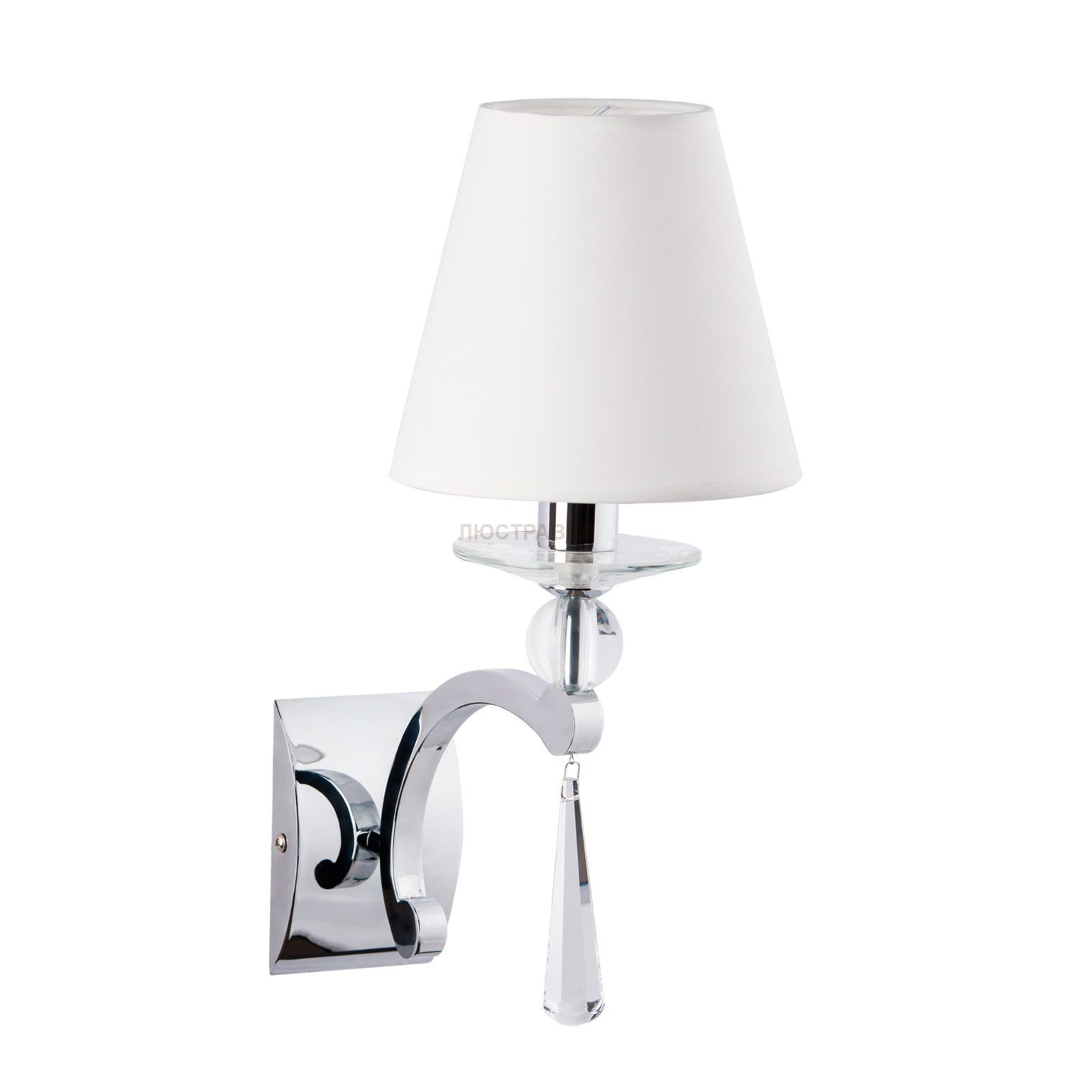 Металлическое основание цвета хрома, текстильный абажур, декоративные элементы из хрусталя