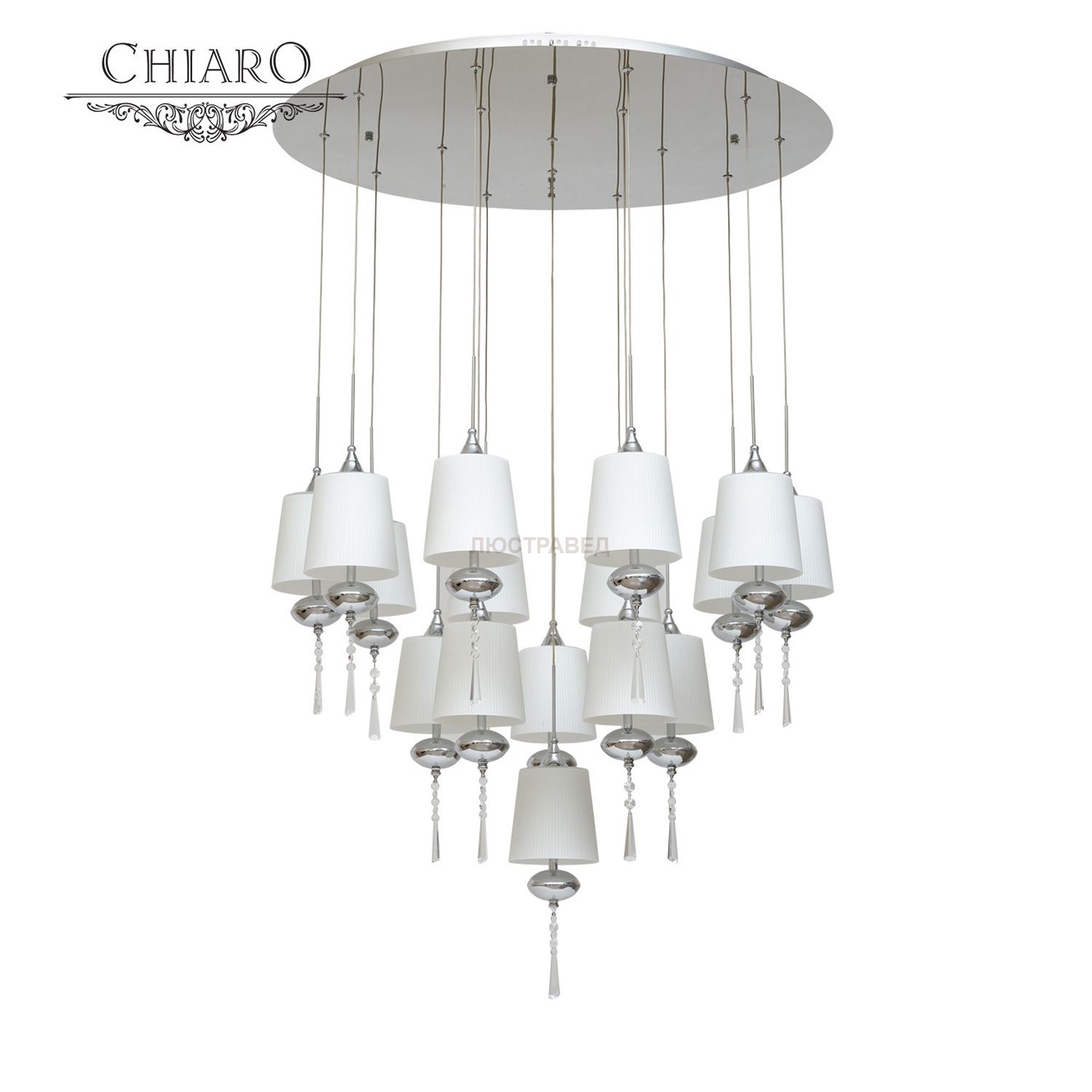 Металлическое основание цвета хрома, стеклянные плафоны, декоративные подвески из хрусталя