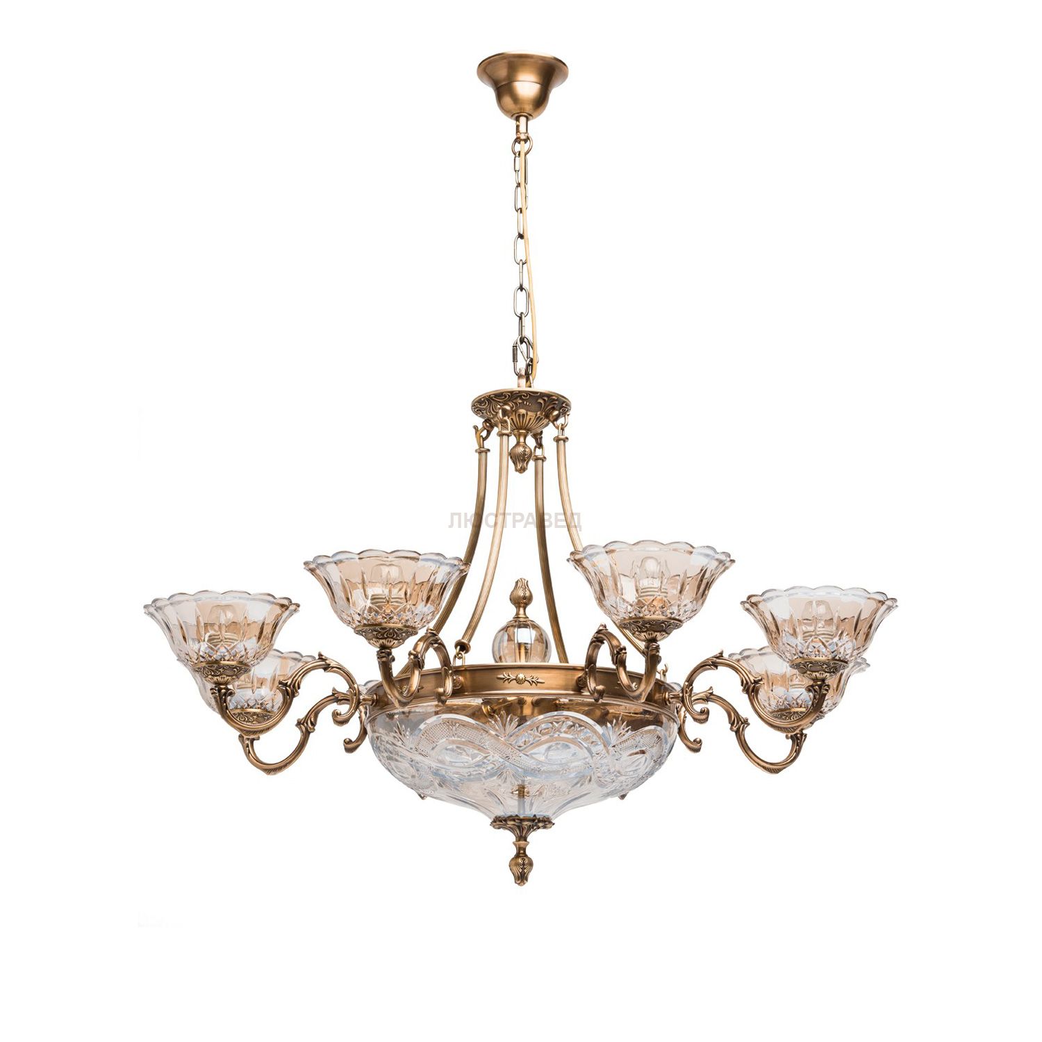 Основание из латуни, плафоны из хрустального стекла, декоративные элементы из хрусталя