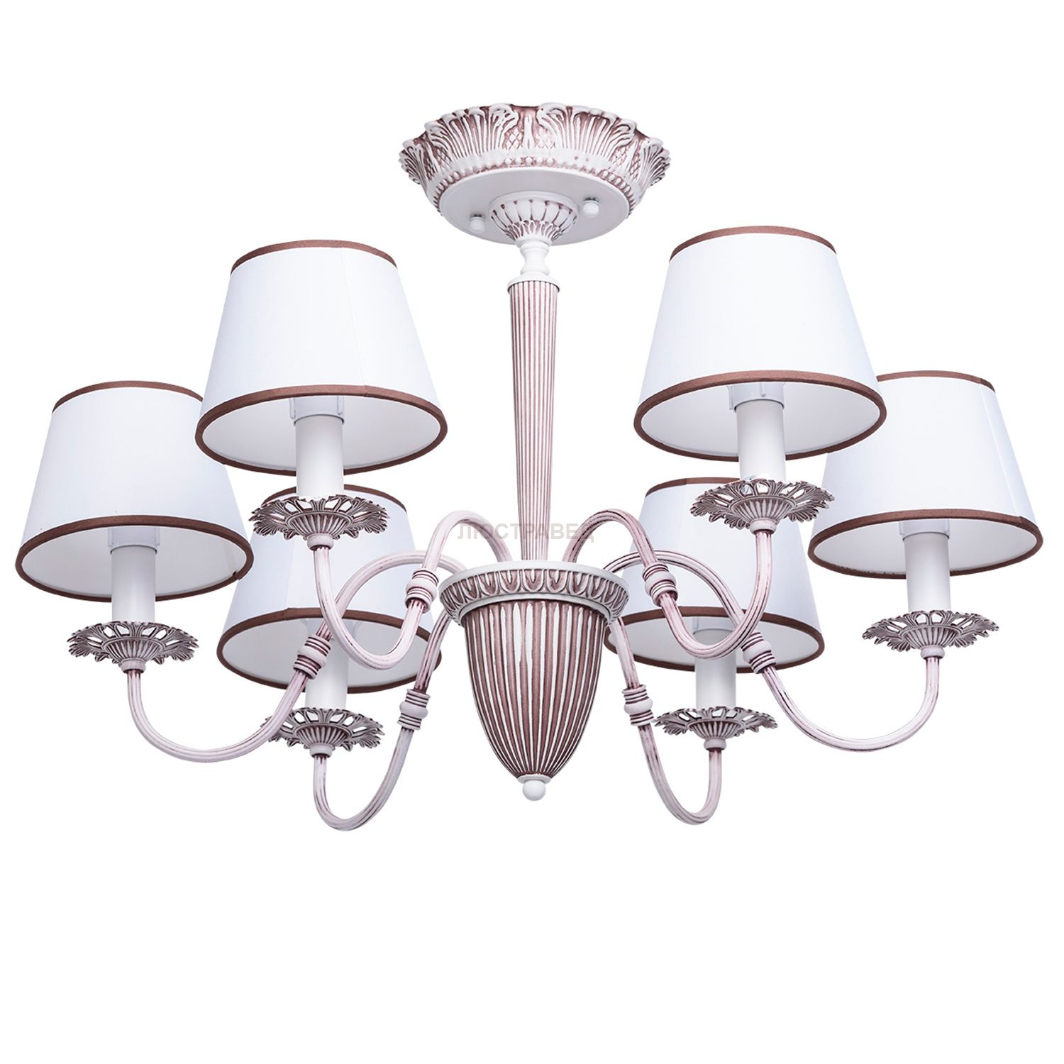 Арматура светильника выполнена из сплава металла и окрашена по сложной технологии: первый слой основной - светло-лиловый, сверху нанесен второй слой, декоративный темно-лиловый с последующим затиранием. Светильник декорирован светлыми текстильными абажурами с термостойким акрилом внутри.