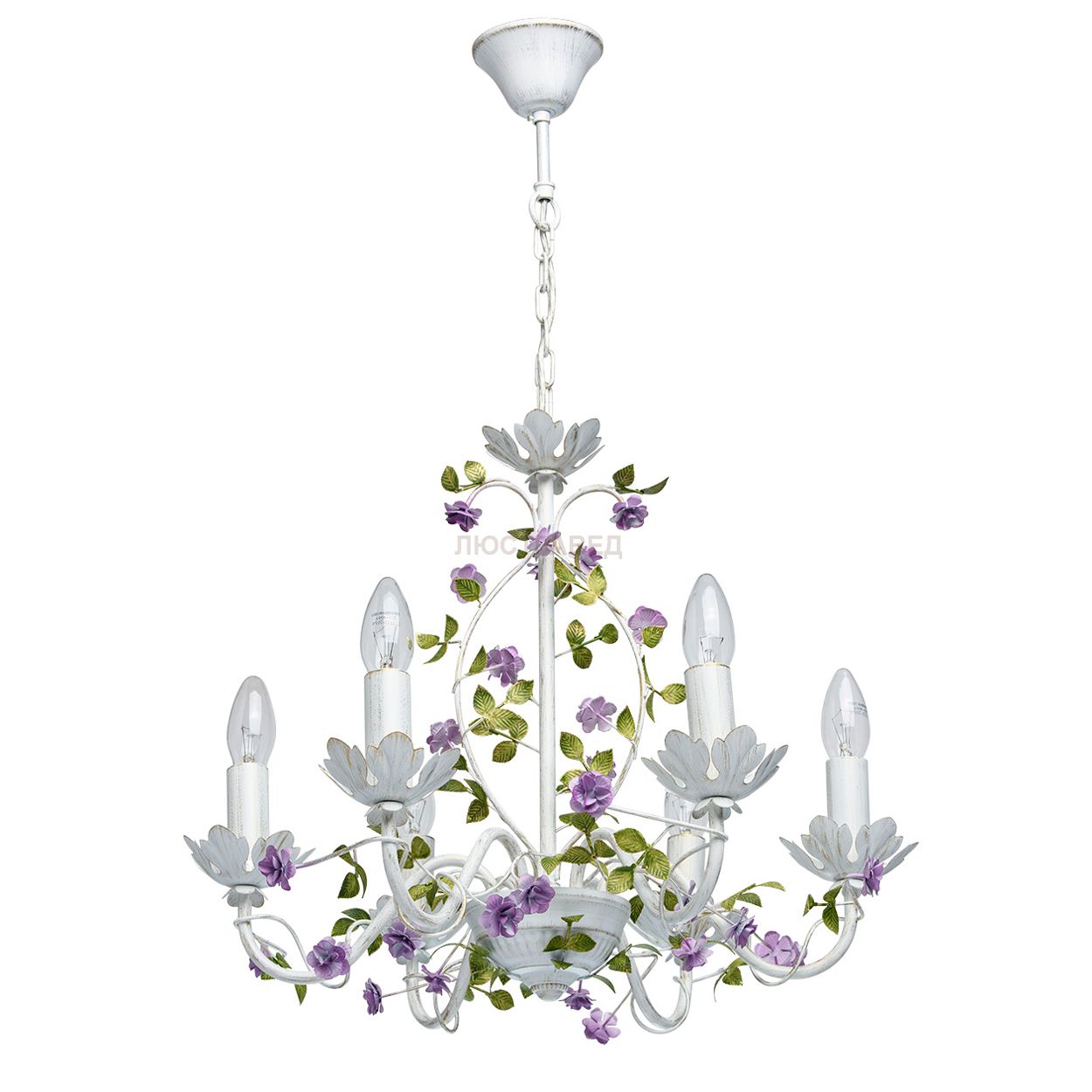 Арматура светильника выполнена из сплава металла и окрашена в ручную в белый и золотой цвет по технологии двойного окрашивания. Декоративные элементы из металла в форме бутонов цветков фиалкового оттенка и зеленых листочков окрашенны вручную.