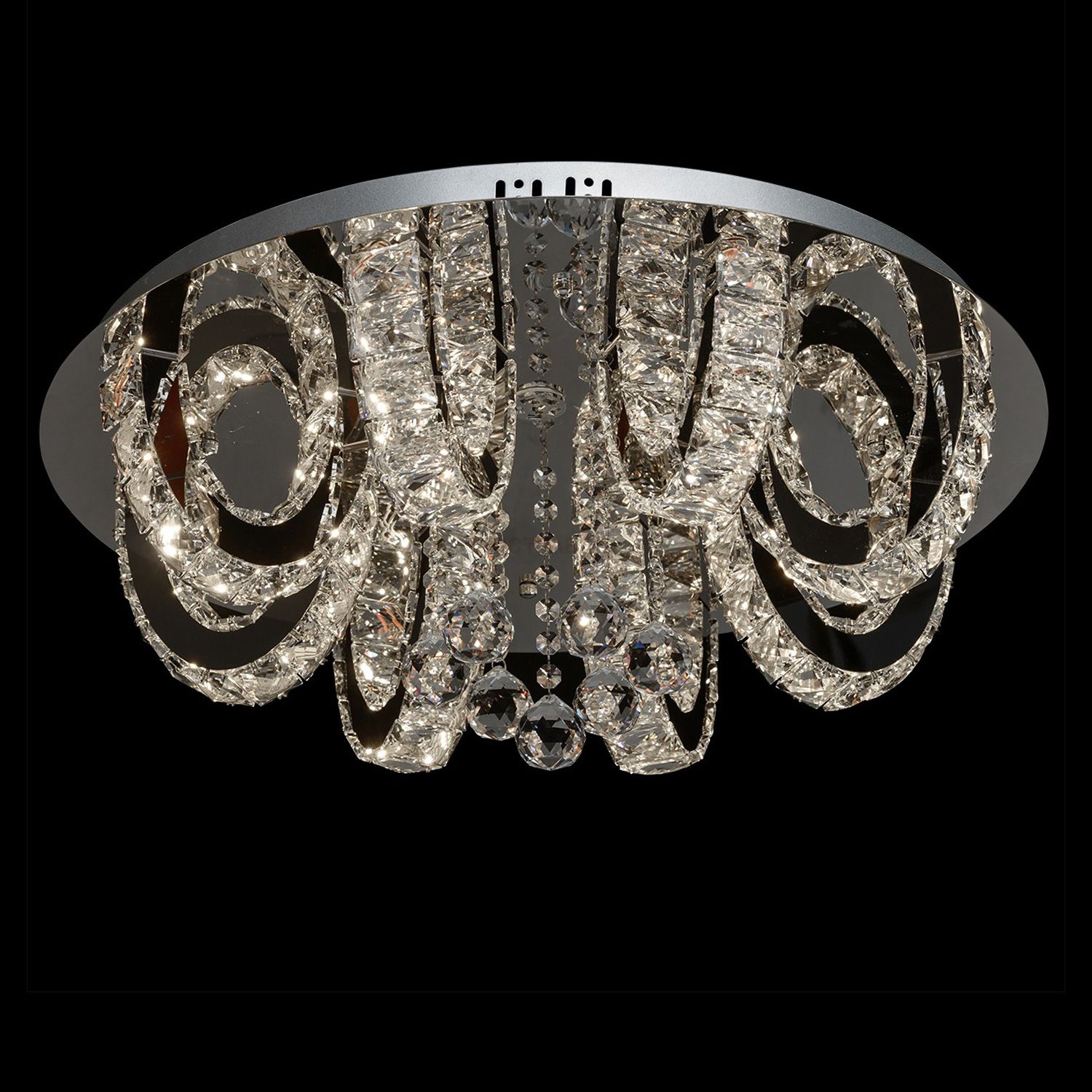 Корпус светильника выполнен из сплава металла и гальванизирован в цвет серебра. Потолочный диск из нержавеющей стали круглой формы, отполирован до зеркального вида. Световые элементы располагаются полукругом и, отражаясь в зеркальной поверхности, создают 3D-эффект. С внешней и внутренней стороны элементы декорированы крупным хрусталем 45 мм с множественными центрами схождения граней. Дополнительный шарм светильнику придают хрустальные подвески сложной огранки. В светильнике использованы два вида светодиодов и два температурных режима света: 4200-4500K и 6300-6502K. В светильнике предусмотрено 7 сценариев освещения за счет разнообразного сочетания теплого и холодного света. Пульт прилагается.