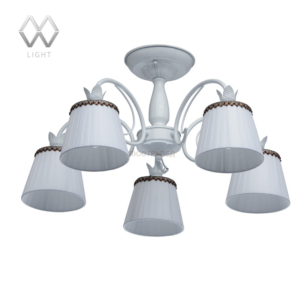 Крашеное металлическое основание белого цвета, текстильные абажуры с тесьмой, декоративные элементы из металла
