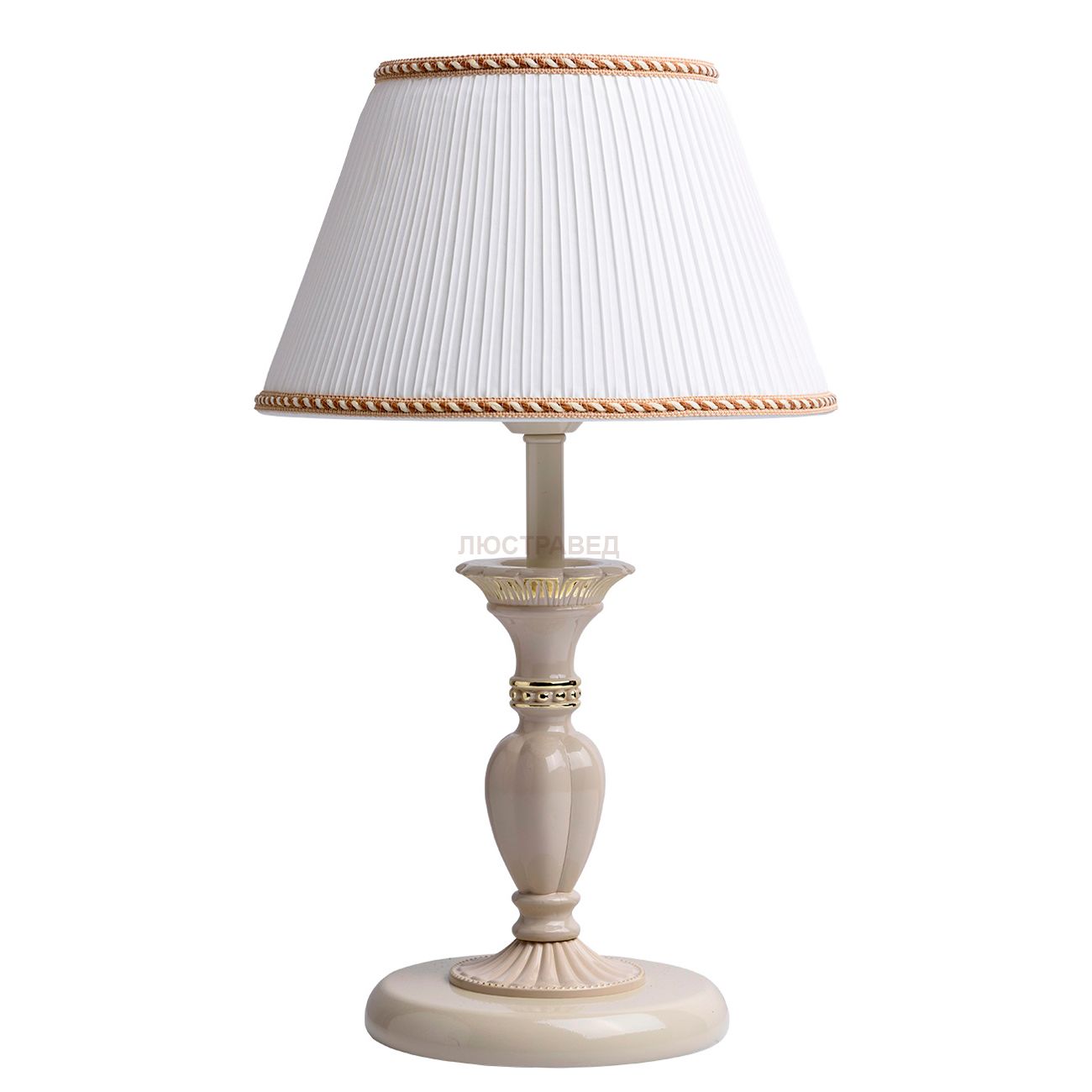 Арматура выполнена из сплава металла с добавлением цинка. Арматура окрашена в цвет слоновой кости по технологии ручного окрашивания с золотой краской. Абажур бежевого цвета выполнен из плиссированного текстиля, с внутренним слоем термостойкого акрила. Края абажура закрыты объемным кантом бежево-коричневого цвета.