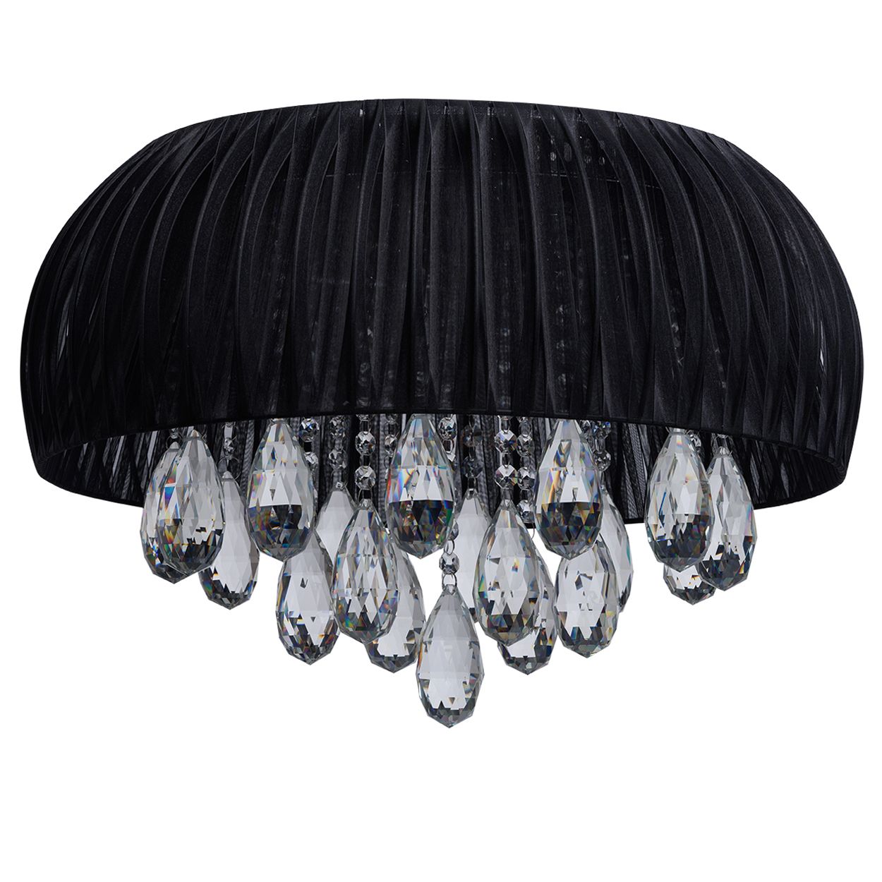 Модный Дизайн в стиле Модерн. Абажур обтекаемой формы трендового черного цвета из органзы. Компактный размер и близкое расположение к потолку дает возможность использовать светильник в помещении со стандартными потолками. Богатые хрустальные декоративные элементы. Экономичные светодиодные источники света.