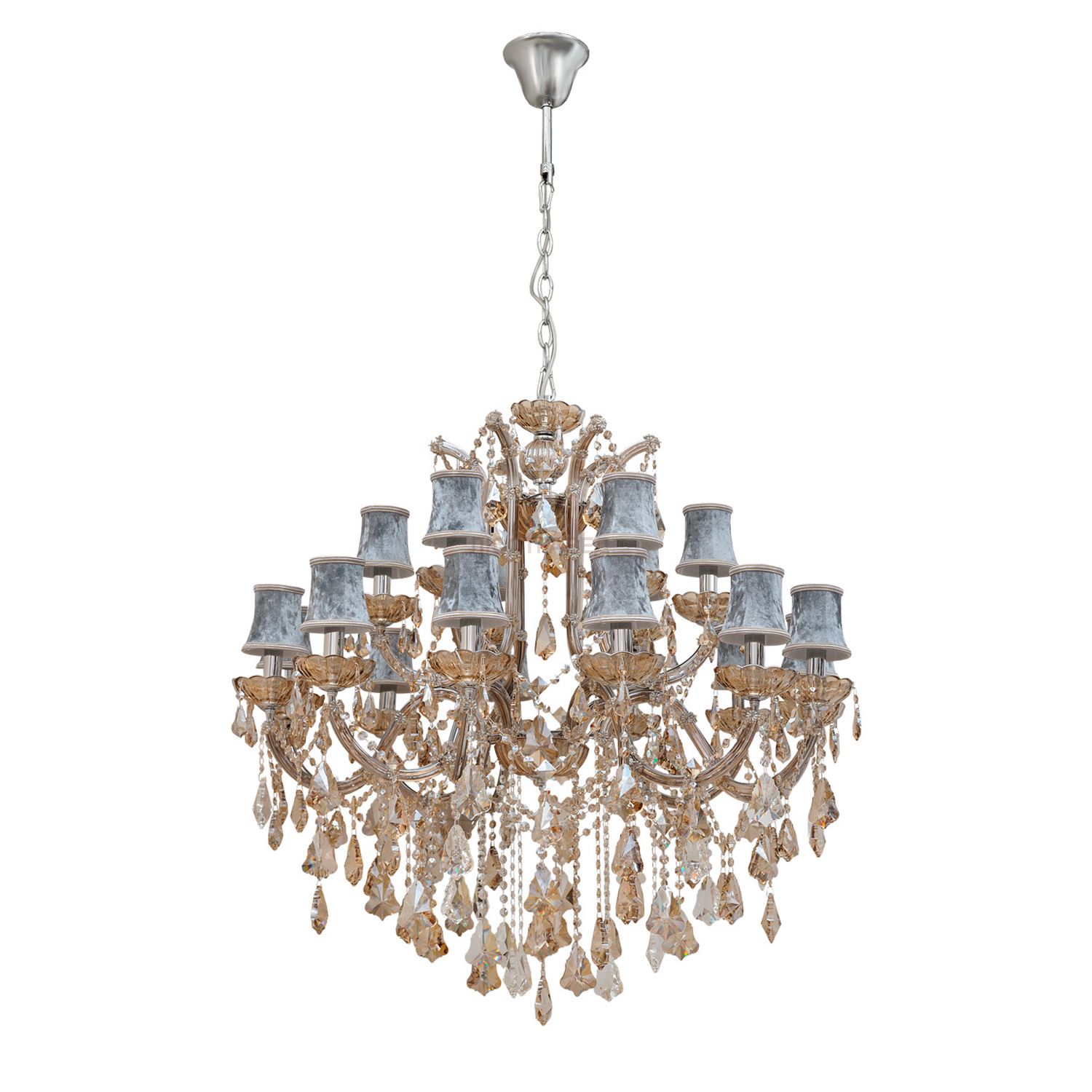 Металлическое основание цвета хрома, стеклянные накладки из выдувного стекла, хрустальные декоративные элементы и подвески прозрачного цвета и цвета шампань, плафоны из серого бархата