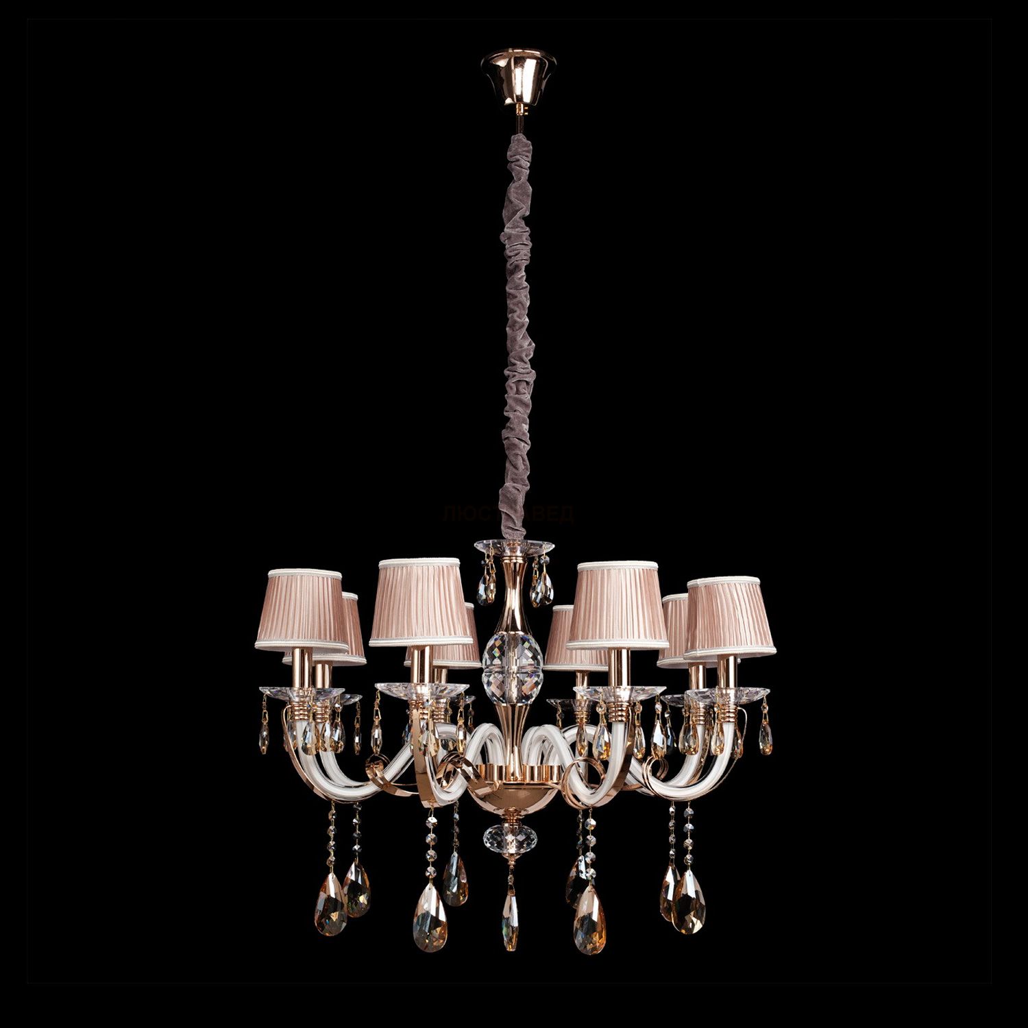 Металлическое основание цвета золота, стеклянные рожки, декоративные элементы из прозрачного хрусталя и цвета «Шампань», текстильные абажуры