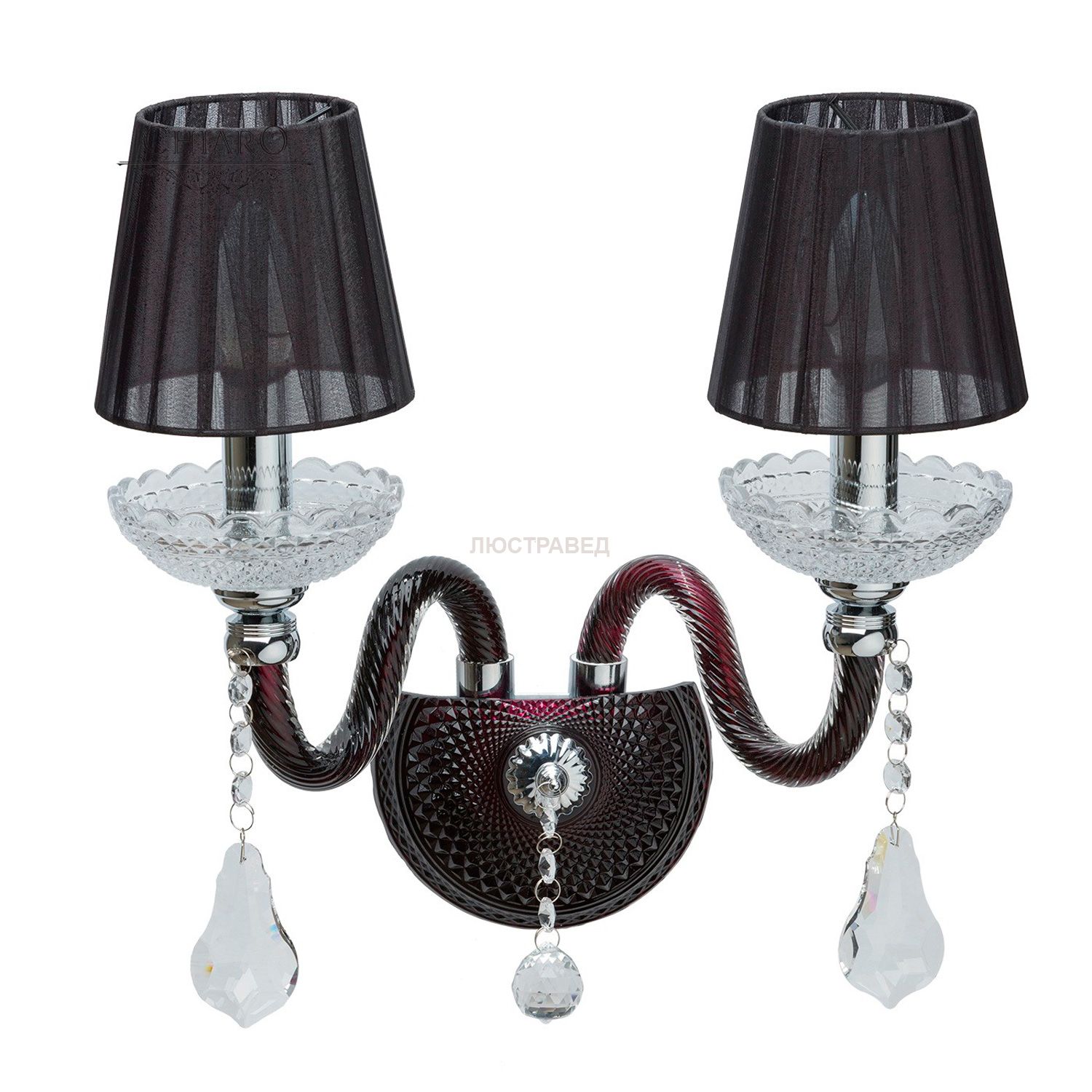 Металлическое основание цвета серебра, рожки из дутого стекла цвета граната, декоративные элементы из прозрачного хрусталя и стекла, текстильные абажуры