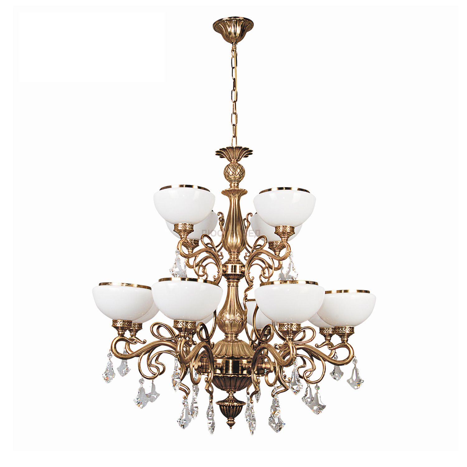 Металлическое основание цвета античной медовой бронзы, плафоны из опалового стекла, декоративные подвески из хрусталя