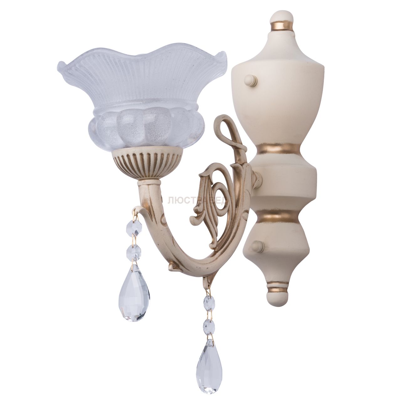 Крашеное металлическое основание цвета слоновой кости с золототистой патиной, плафон из стекла покрытого стеклянной пудрой, декоративные элементы из стекла и хрусталя