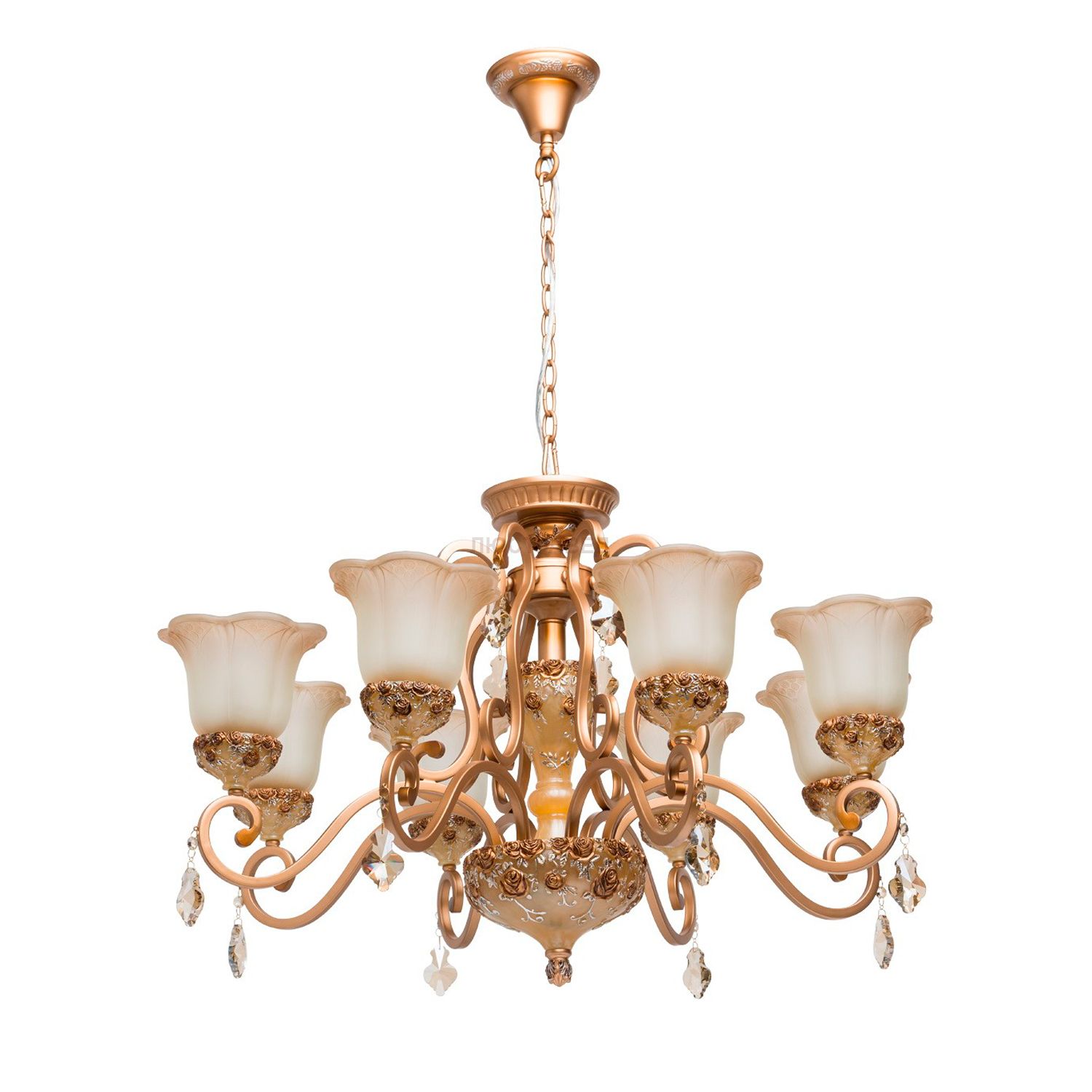 Кованная арматура из сплава железа, окрашена вручную плотным, равномерным слоем. Декоративные элементы из полупрозрачного искусственного каучука (полирейзена) отлитого в форму с последующим двухслойным, двухцветным окрашиванием. Плафоны с волнообразным краем отлитые в форму.. Подвесы из гальванизированного хрусталя цвета «шампань», в тон арматуры, хрусталь ТМ F&D Crystal.