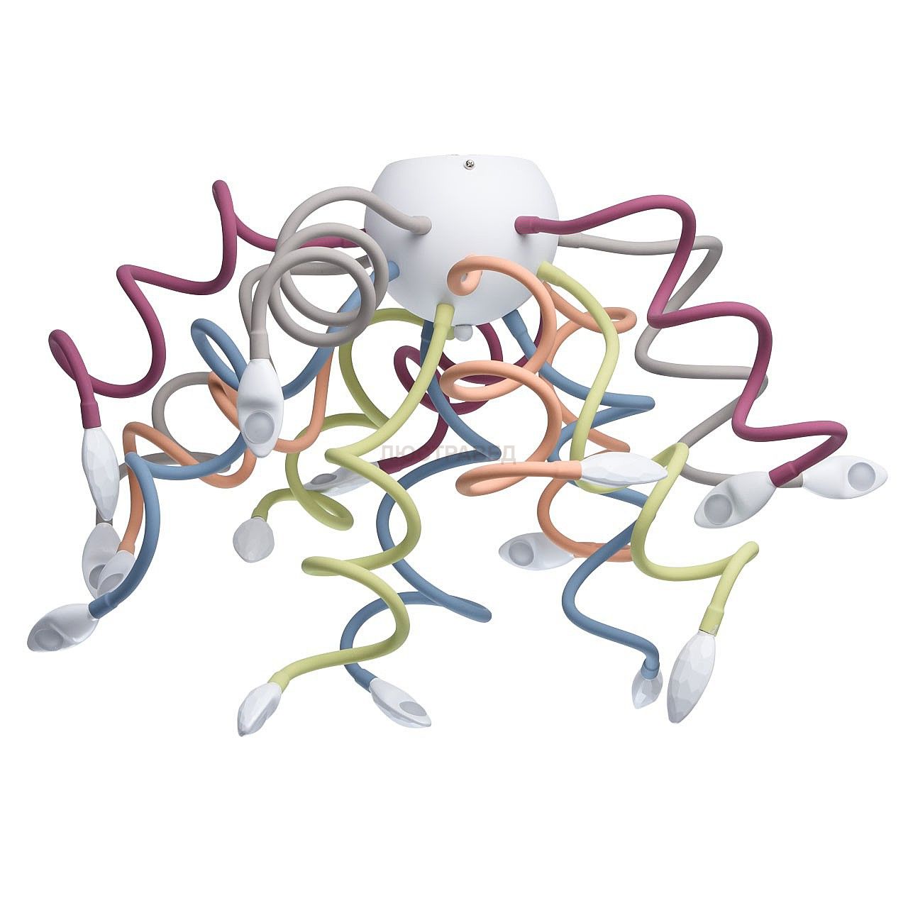 Светильник выполнен в ультрасовременном стиле хай-тек.Главная отличительная черта светильника – это гнущиеся во все стороны рожки, с помощью которых можно создавать любые световые композиции. Светильник необычного дизайна, разноцветный и радостный, с рожками разных цветов, добавляет интерьеру легкости и задора.Светильник оборудован экономичными и долговечными в использовании светодиодами. Потолочный светильник дополнен бра, что позволяет комплексно осветить помещение.