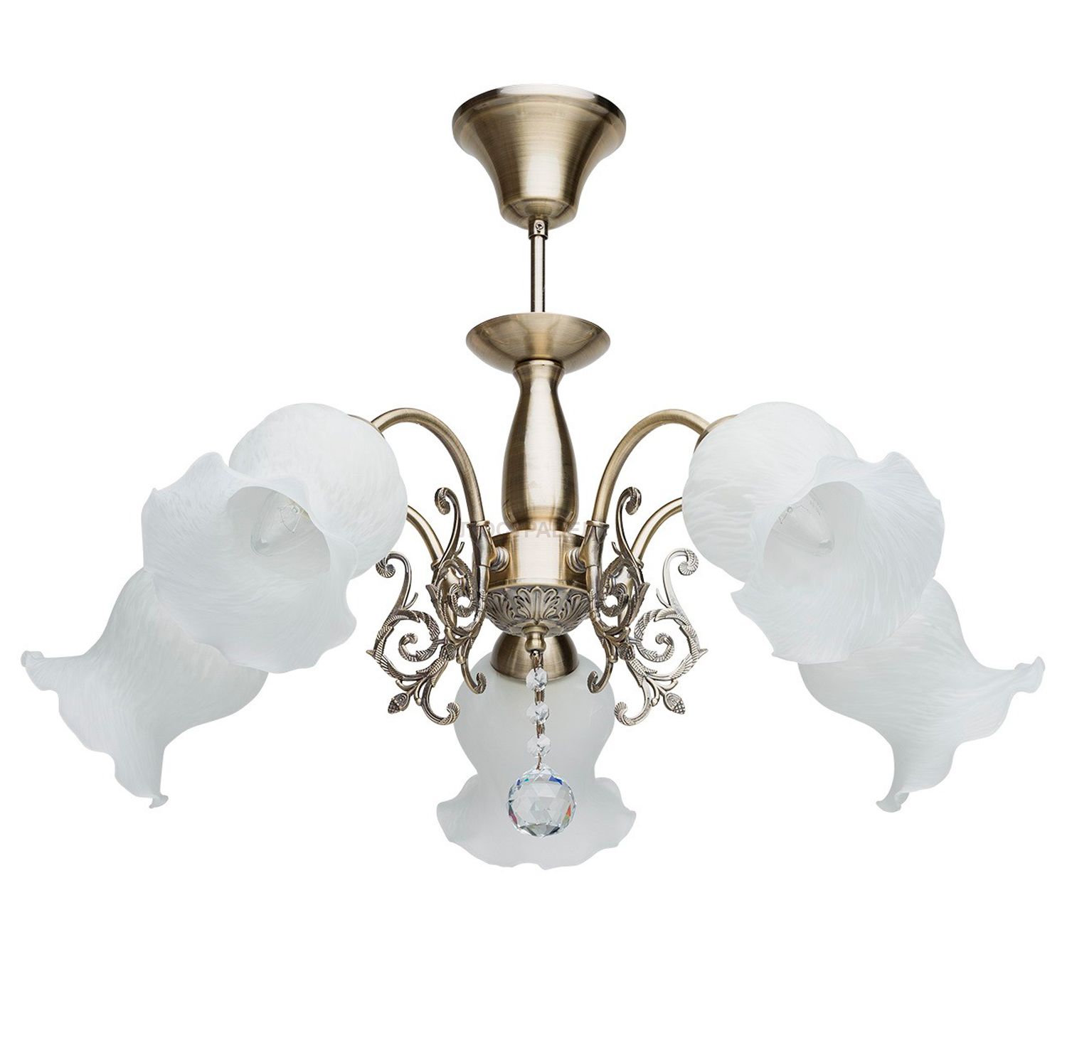 Металлическое основания цвета античной бронзы, плафоны из матового стекла, декоративная подвеска из хрусталя