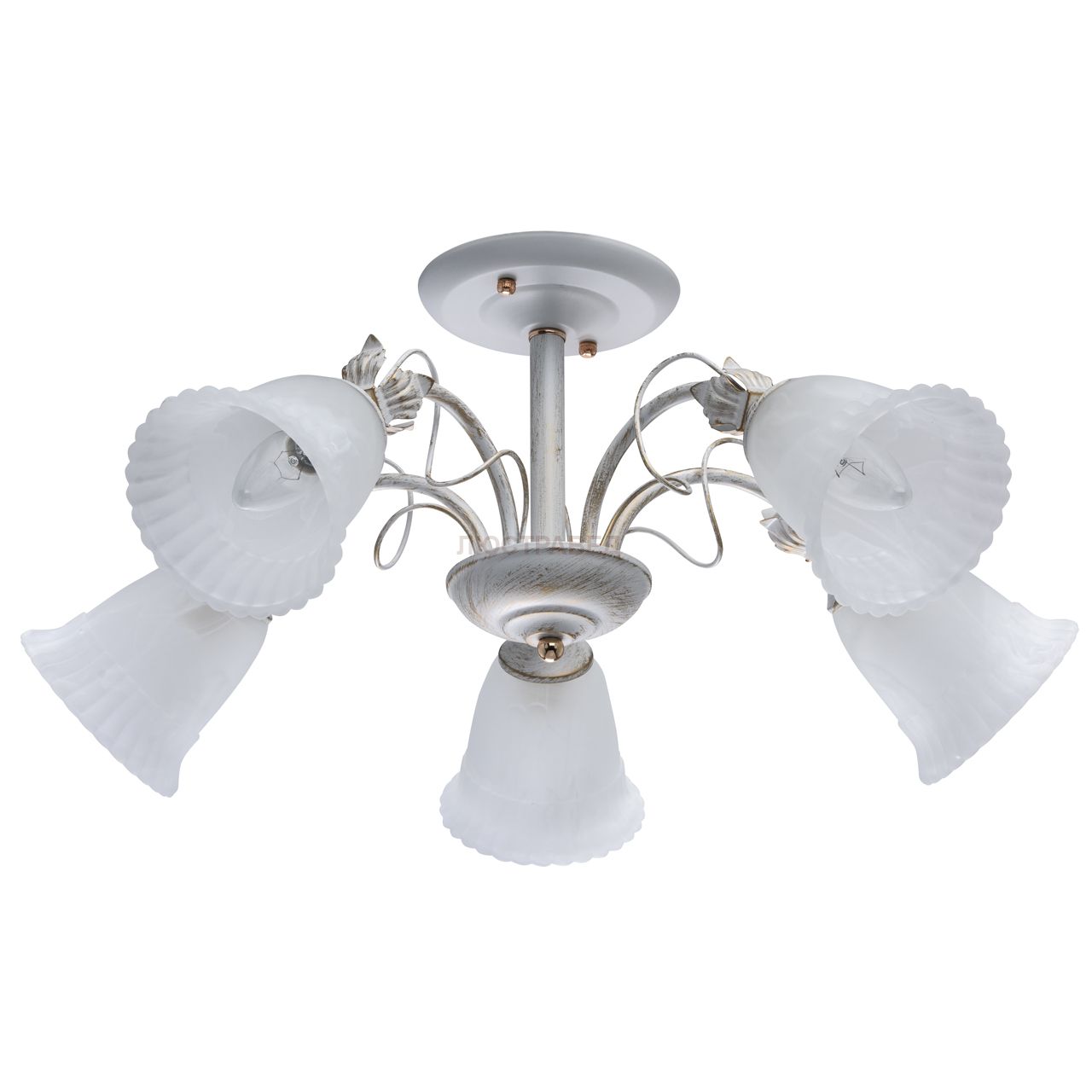 Основание из облегченной стали окрашено в белый цвет с золотистой патиной. Плафоны: стекло с добавлением алебастра