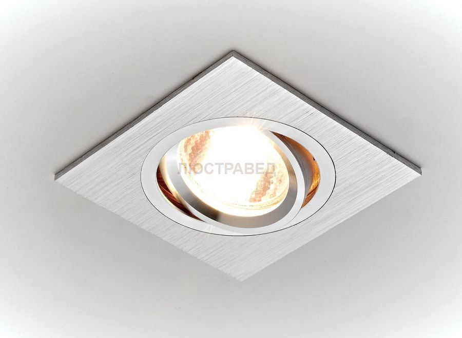 Поворотный встраиваемый точечный светильник простой квадратной формы без декора цвета матового алюминия. Способ крепления - пружинный механизм в виде усиков.