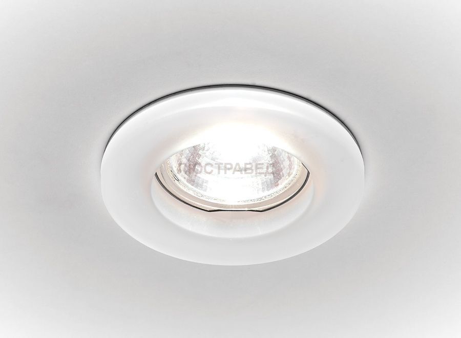 Неповоротный встраиваемый светильник простой круглой формы без декора из матового белого стекла.