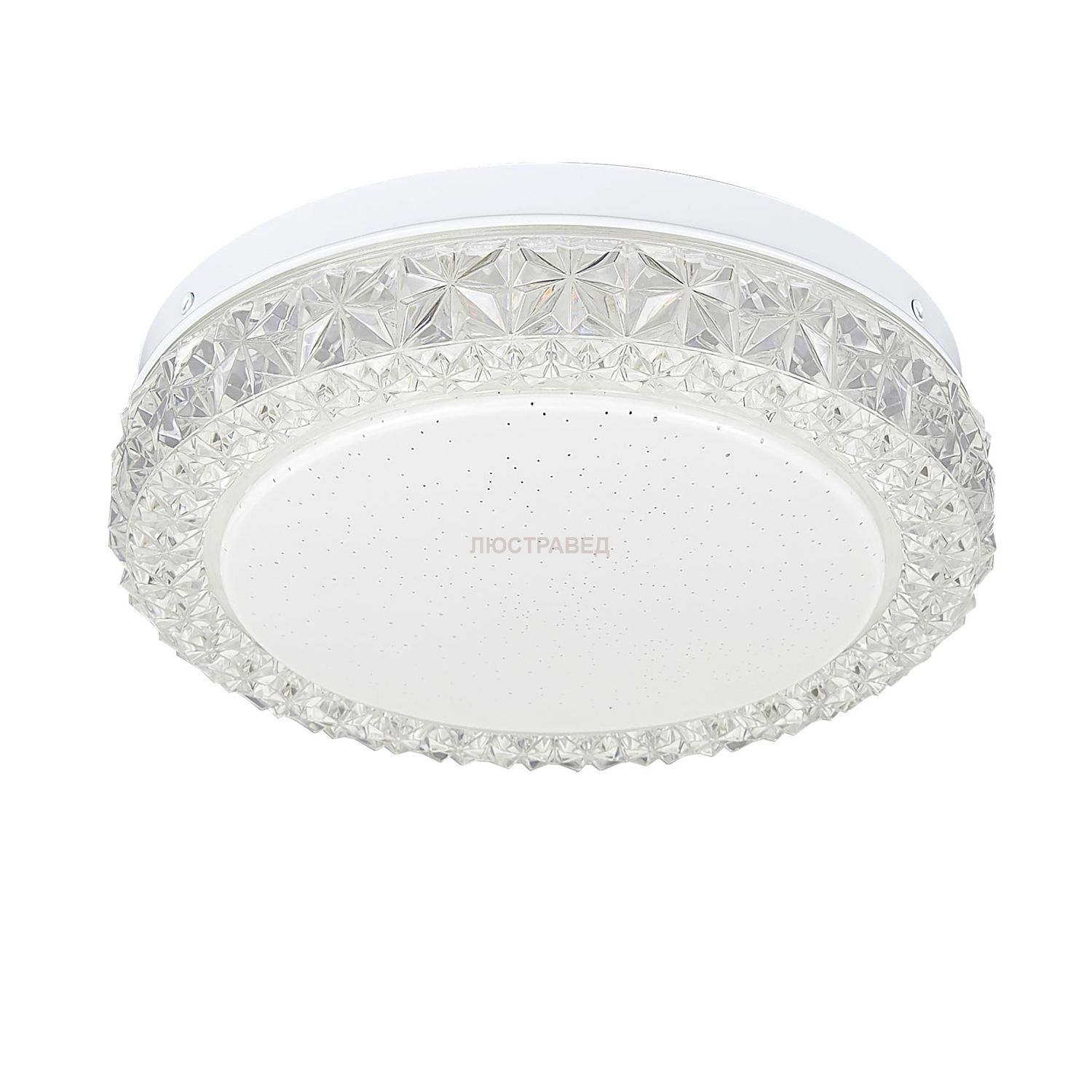 Диаметр 20см, Высота 6,5см, Светодиодный светильник мощностью 12Вт с хрустальным эффектом на ободе и эффектом "старлайт" на матовом рассеивателе, Уровни мощности 100-50-5% управляются обычным выключателем