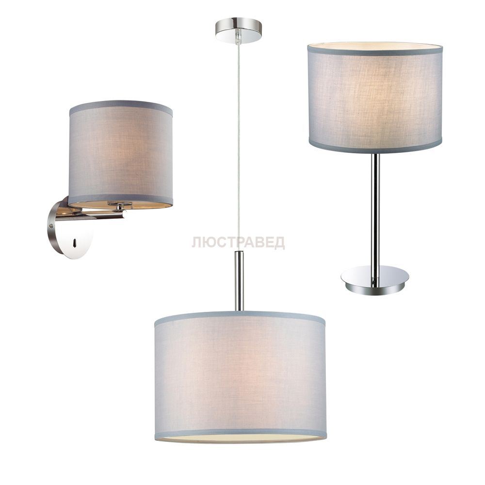 комплект включает в себя подвес, настольный и настенный светильники, цвет каркаса хром, светло-серая ткань абажуров, настенный светильник с выключателем
