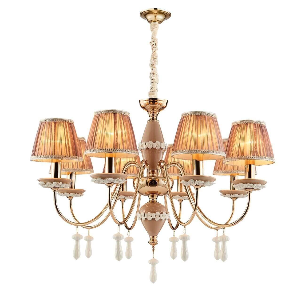 каркас цвета золотой гальваники, декоративные элементы из керамики бежевого цвета с белыми керамическими цветами и подвесками, абажуры из пыльно-розовой ткани