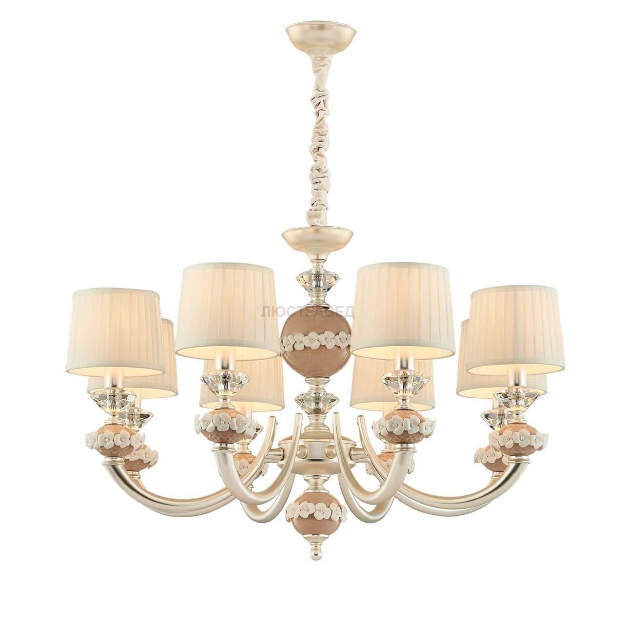 каркас серебряного цвета, декоративные элементы из керамики бежевого цвета с белыми керамическими цветами, абажуры из белой хлопковой ткани