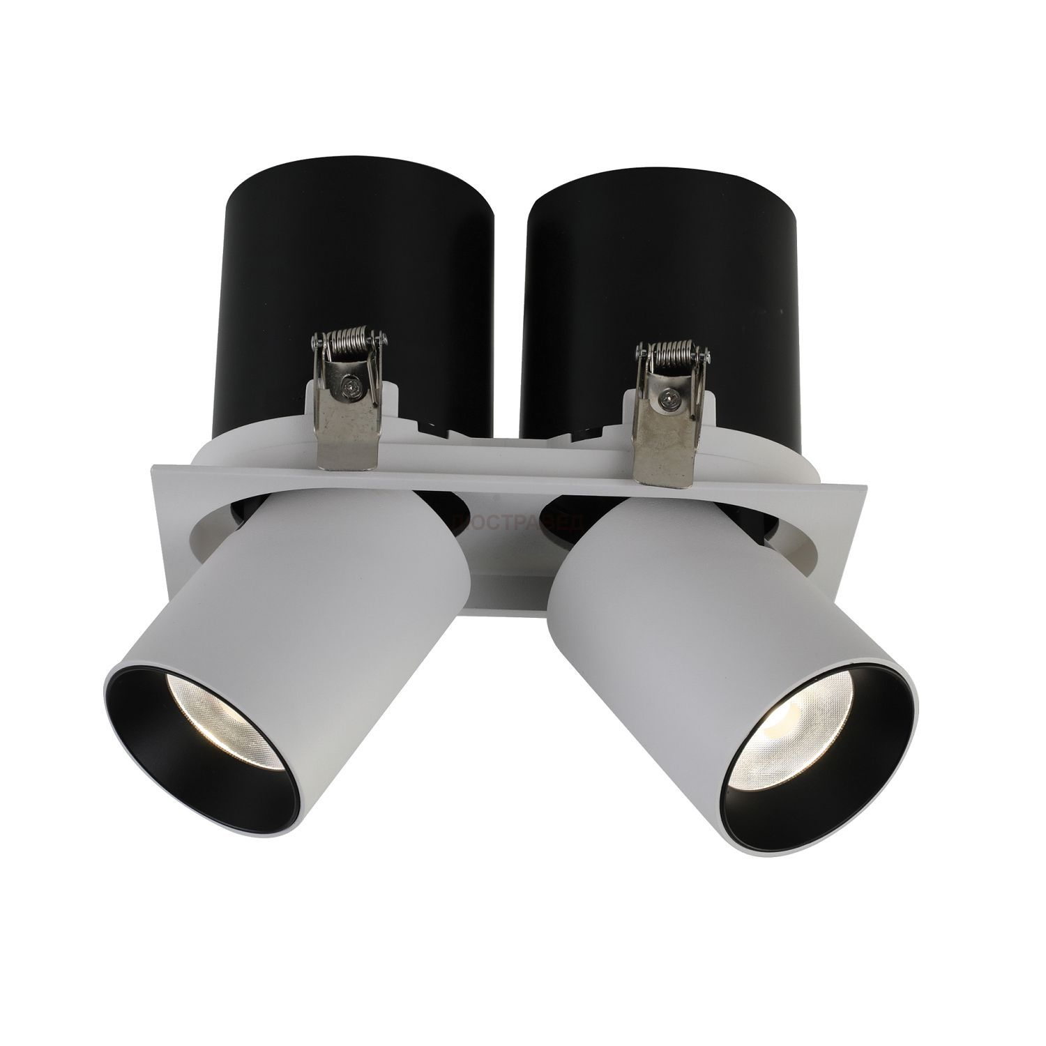 встраиваемый светильник белого матового цвета с черными элементами, выдвижной поворотный плафон, который может полностью войти в каркас делая светильник плоским