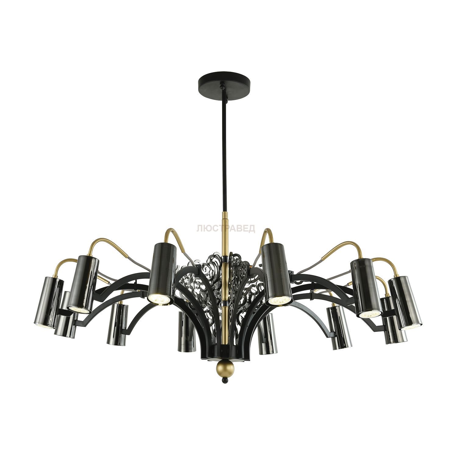 сочетание металла цвета черного хрома и окрашенного золота, центральная трубка состоит из нескольких частей, что позволяет регулировать высоту люстры