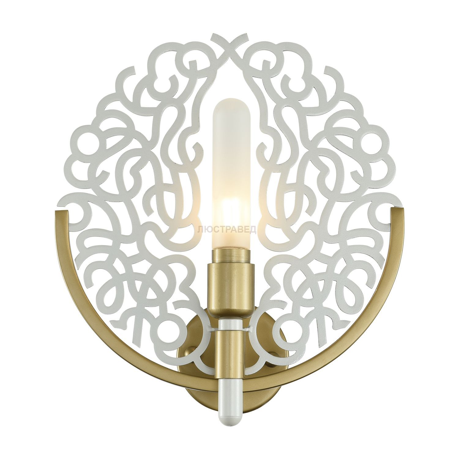 сочетание металла жемчужно-белого цвета с элементами золотого цвета, стеклянный плафон из матового стекла