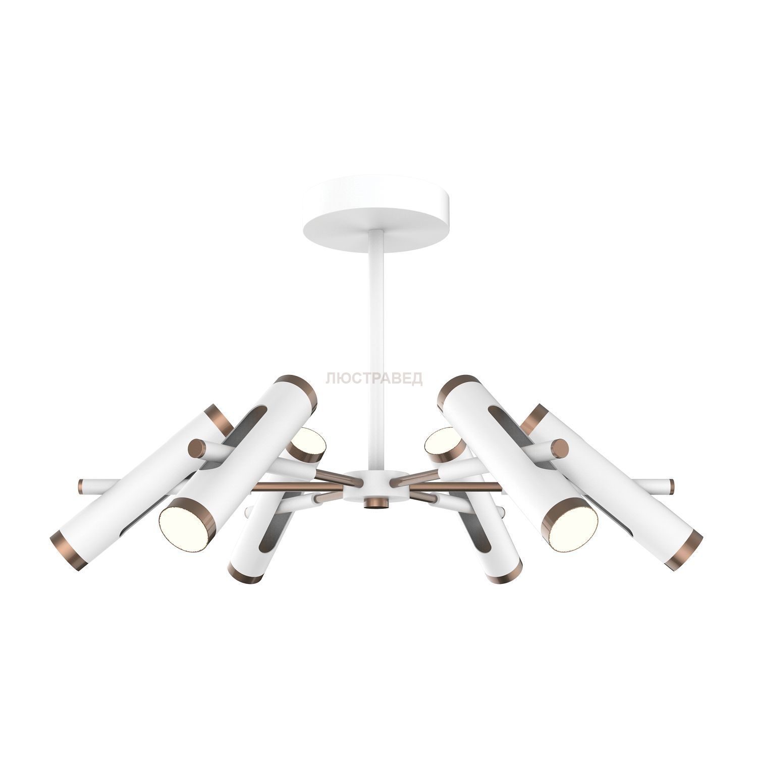 металл белого матового цвета, элементы окрашены в золотисто-коричневый цвет, все плафоны поворотные, модули LED с двух сторон плафона