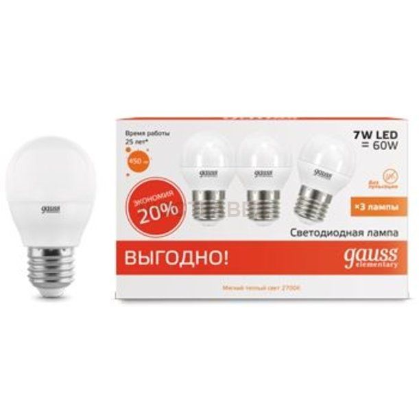 Отзывы Лампа Gauss LED Elementary Шар 7W E27 2700K 1/40 (3 лампы в упаковке)