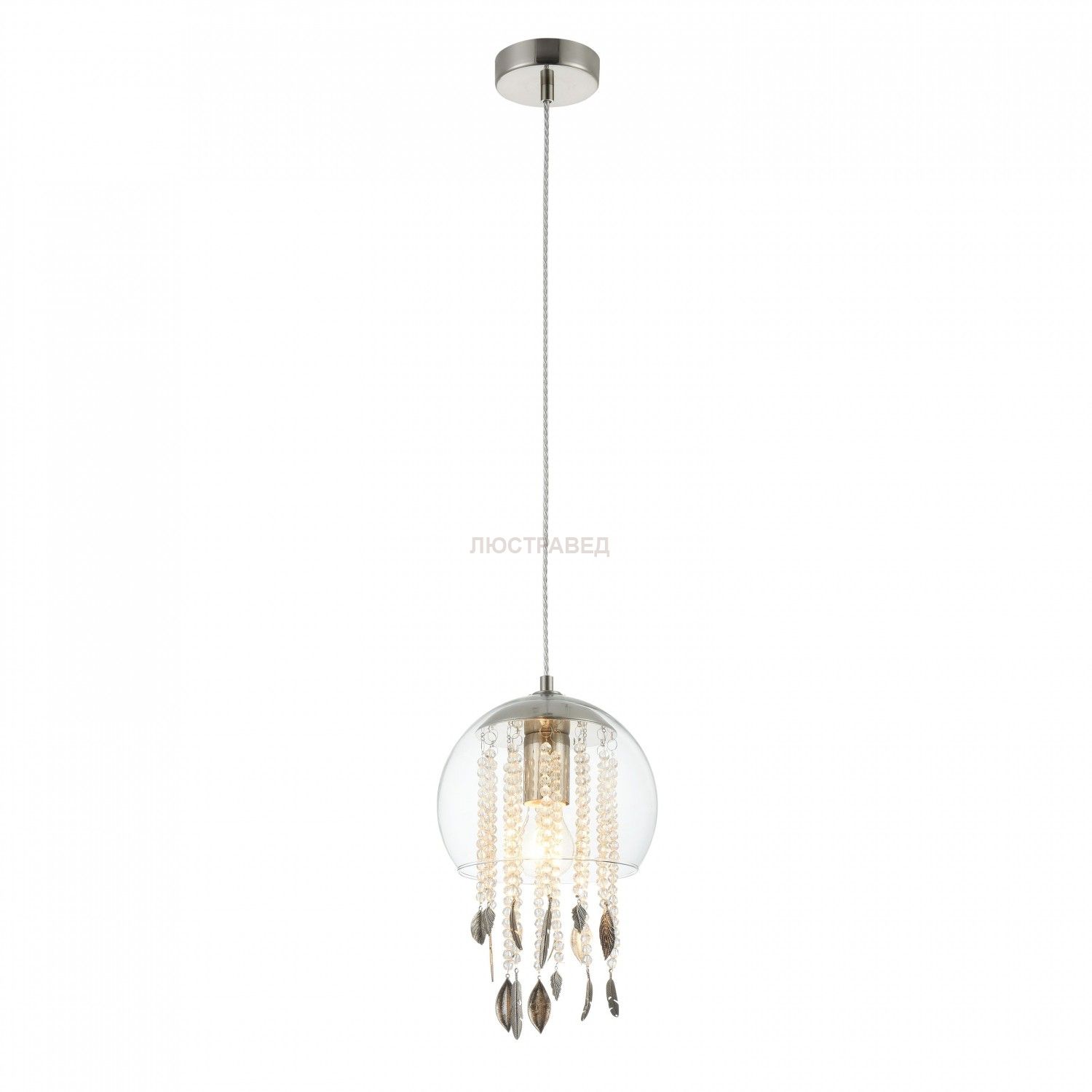 Каркас из металла. Украшен *хрустальными подвесками с металлическими лепестками. Плафон из прозрачного стекла.