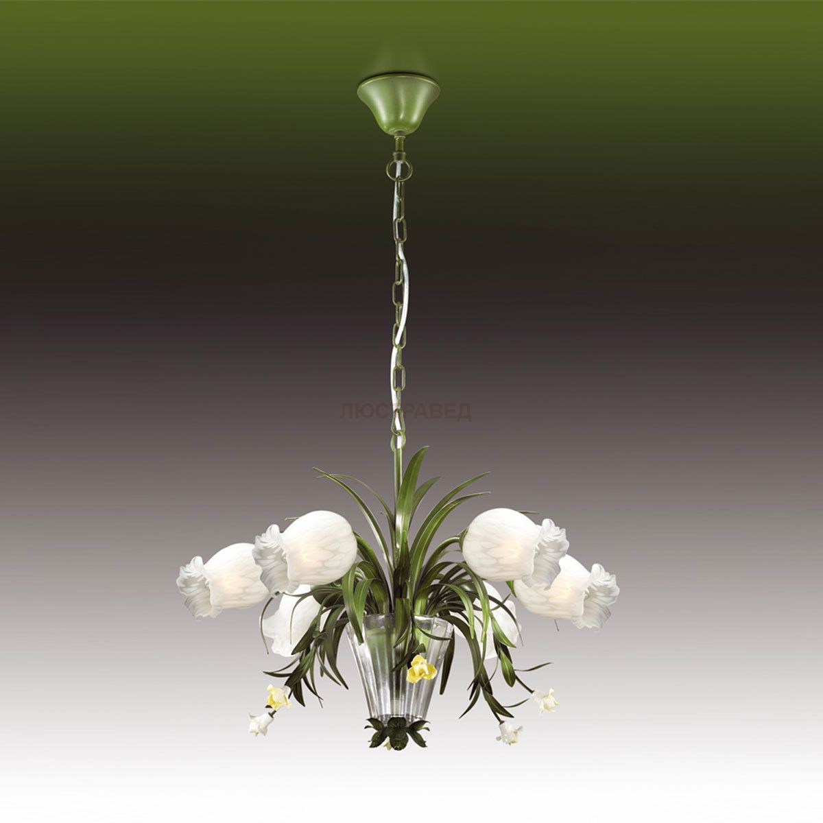 плафон: из белого стекла в виде бутона, арматура: металл, декор: декоры в виде цветков из керамики, ваза из стекла