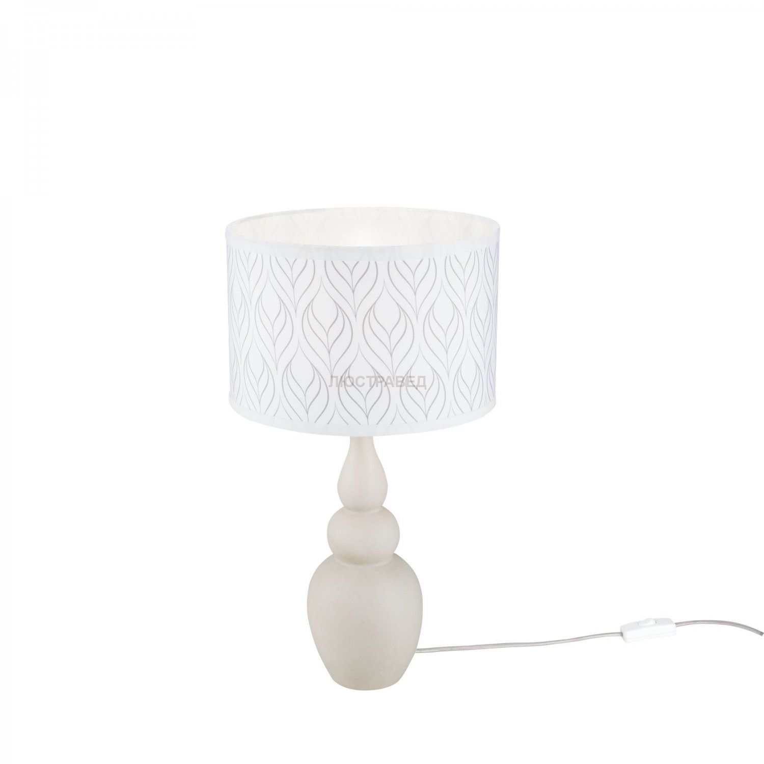 Керамическое основание. Абажур из ПВХ покрыт льняной тканью с узором.